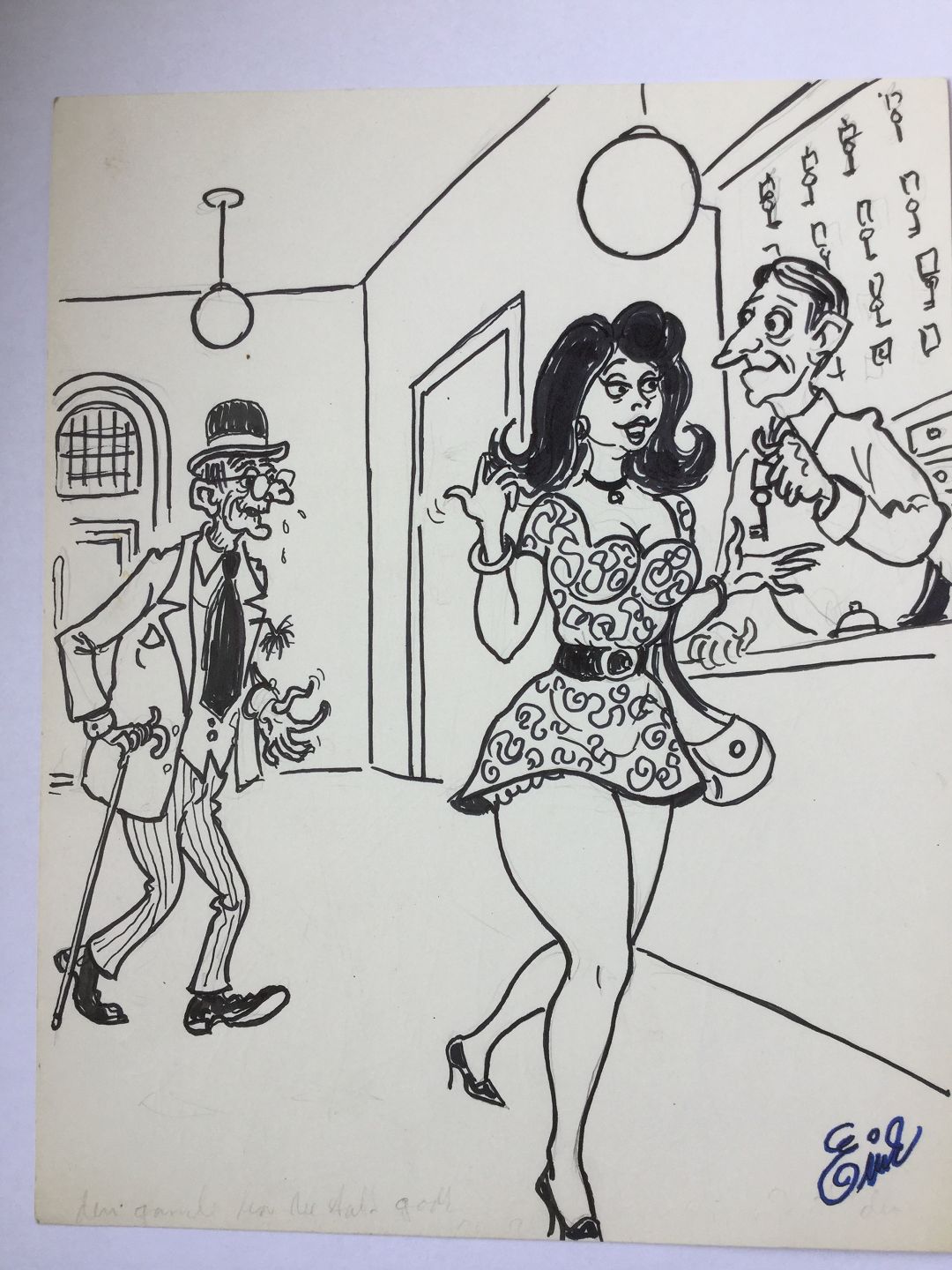 Tegning af Svend Erik Jensen -Hotelreception med ældre herre og letlevende dame.