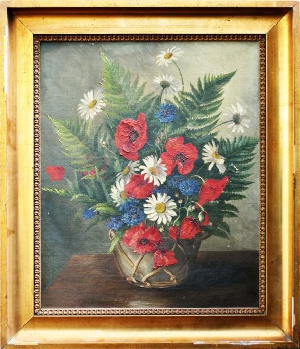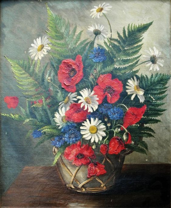 Dansk kunstner (20. årh.): Blomster opstilling. Olie på lærred. Usigneret. 46 x 38 cm.