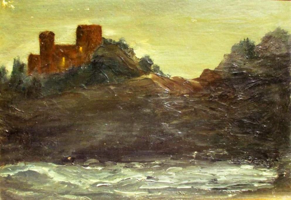 Doare, Marcel Le (20. årh): En borg - aften. Olie på plade. Signeret. 16 x 23 cm.