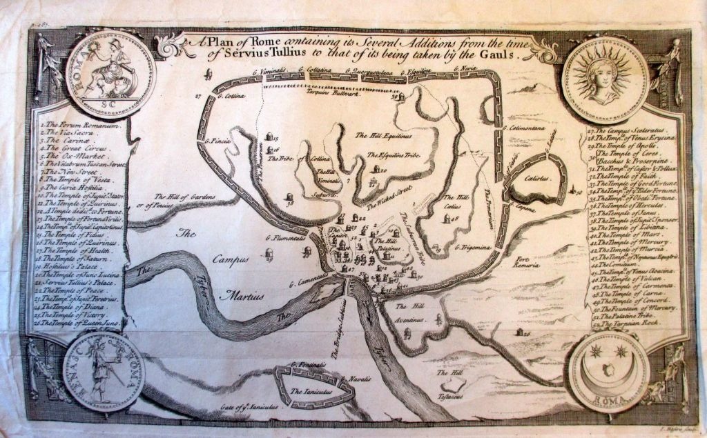 Map of Rome at Servius Tullius time, 18th century. Copper print. Done by I. Basire. 19 x 30 cm. Unframed. Tullius ruled in Rome from 575-535 BC