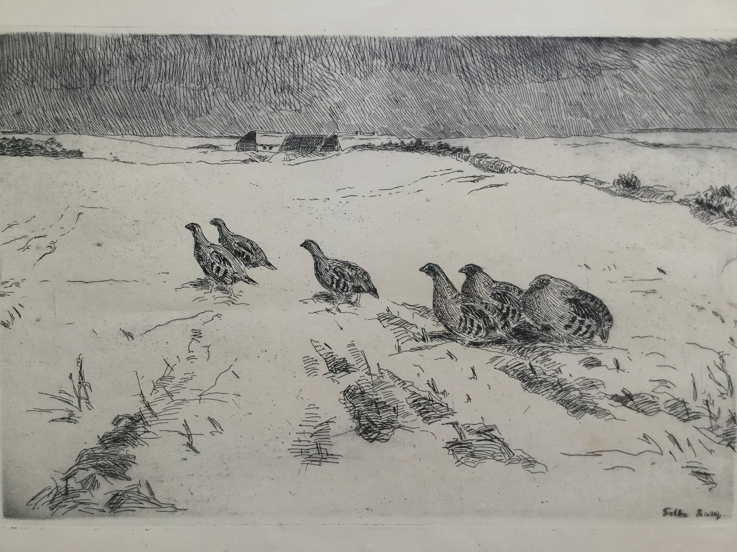 Radering af Falke Bang - Vinterlandskab med agerhøns.