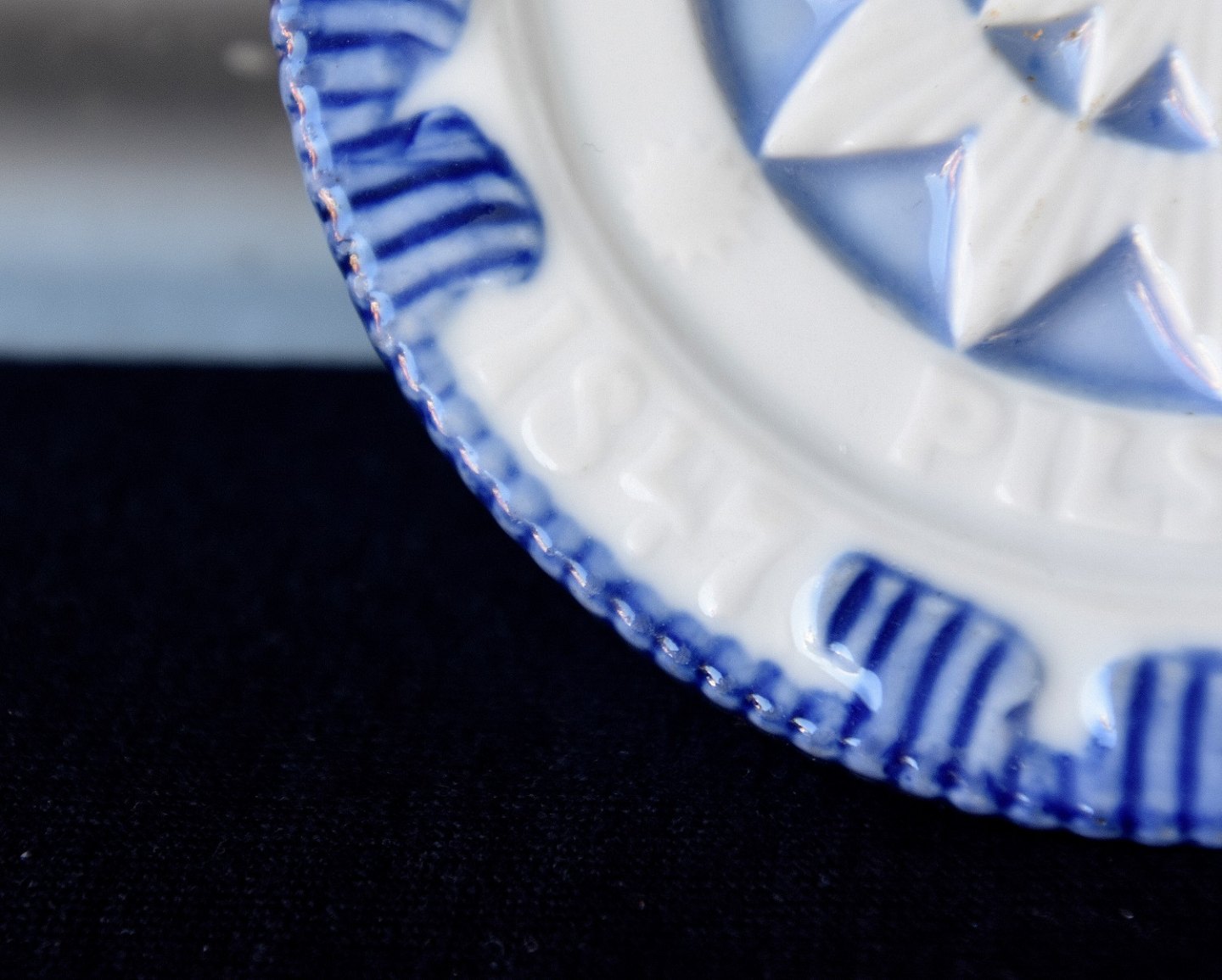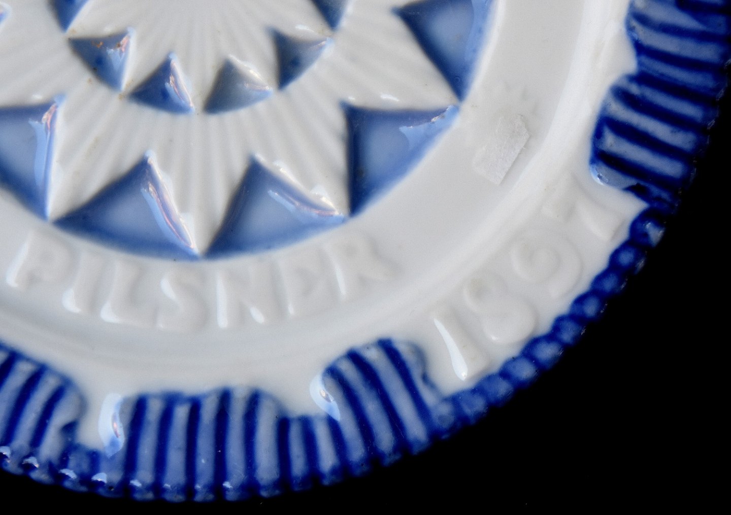 Bing & Grøndahl øl platte. Den hvide tekst: "Gamle Carlsberg 1847-1897 lagerøl porter pilsner". Må være lavet i anledningen af 50 års jubilæum.