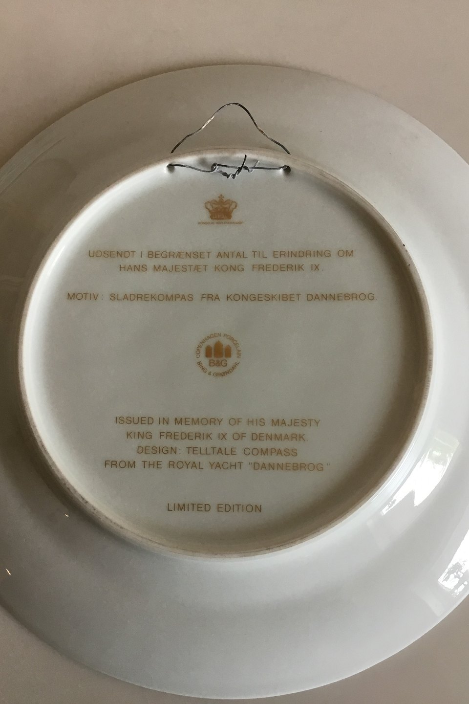 Bing og Grøndahl Mindeplatte Frederik IX REX 11.3.1899-14.1.1972. Til erindring om Hans Majestæt Frederik IX. Motiv: Sladrekompas fra Kongeskibet Dannebrog. Måler 24,7 cm / 9 23/32 in.