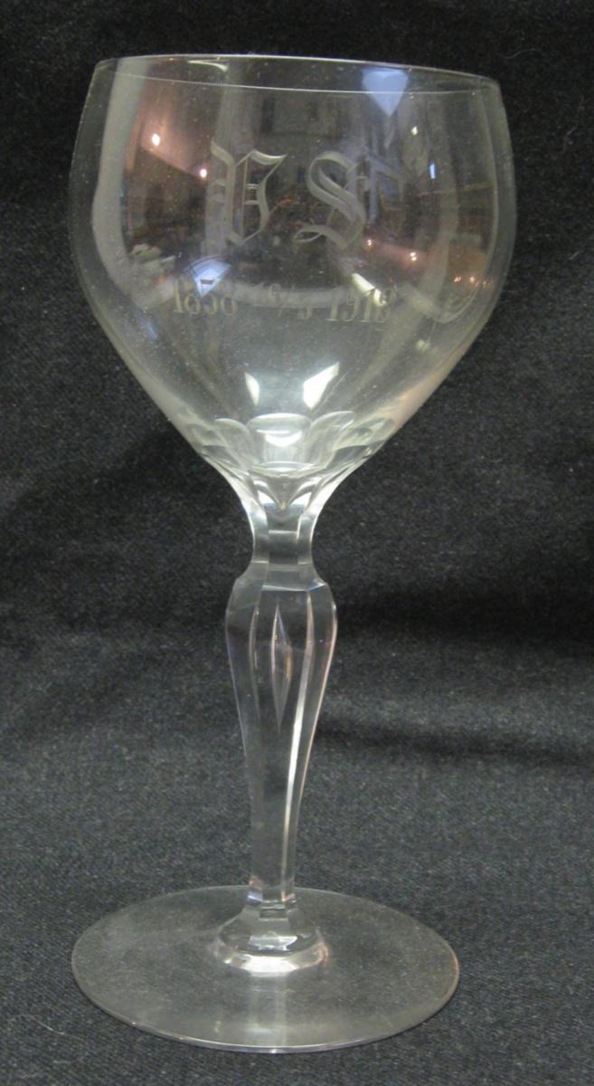 Krystal pokal, 1918. Med rund fod, slebet stilk og kumme. Kumme med indgravering 1858 - 1918. H.: 24 cm. Dia. fod.: 11 cm.
