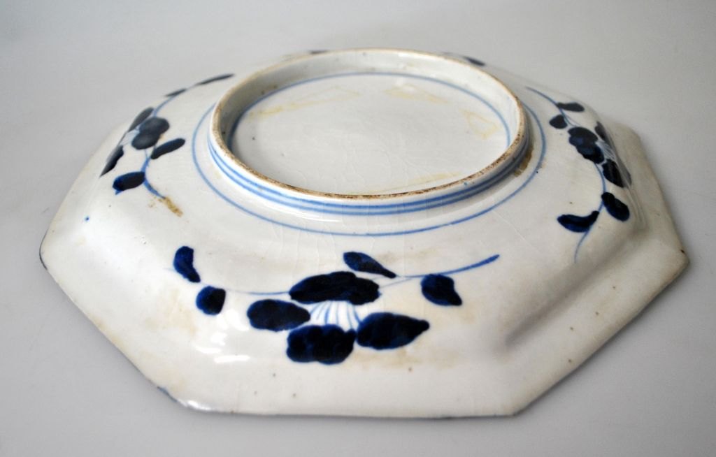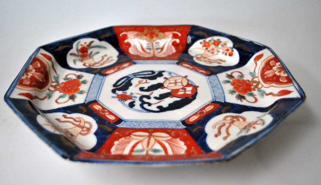 8 kantet Imari tallerken, 19. årh. Japan. Polykrom dekoreret med blomster og forgyldning. 23,5 x 23,5 cm.