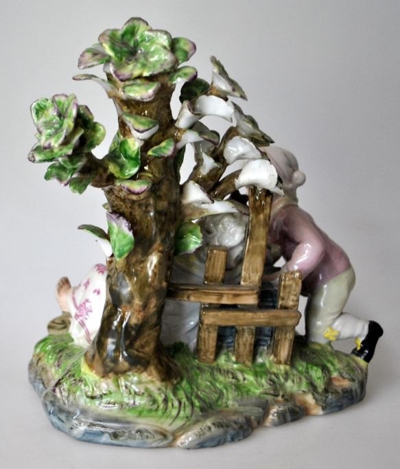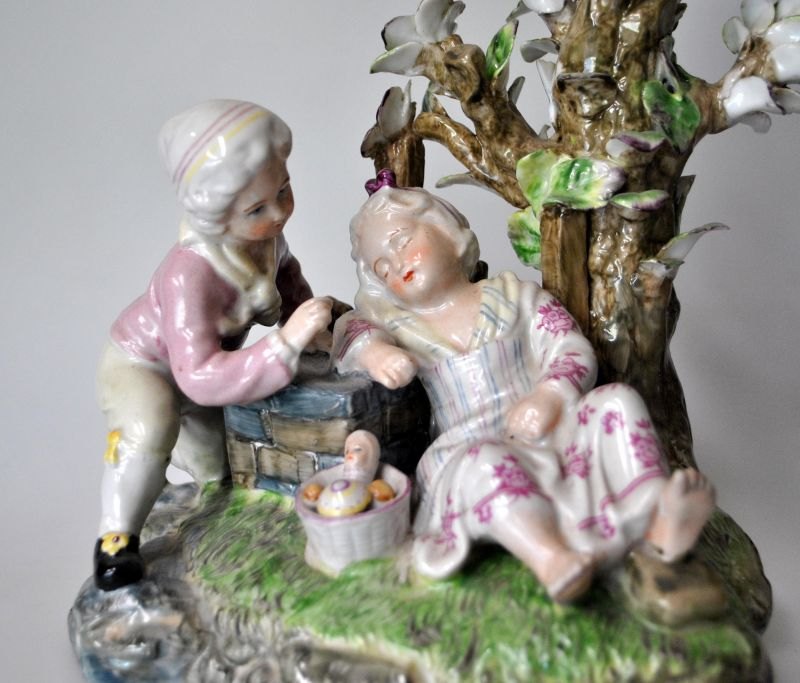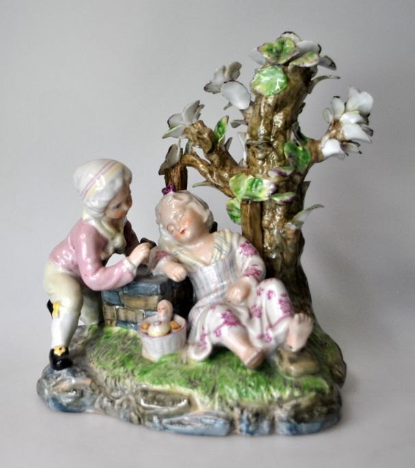 Tysk porcelæns figur, 19. årh. En dreng vækker en pige ved et træ. Stemplet. 18 x 20 cm.