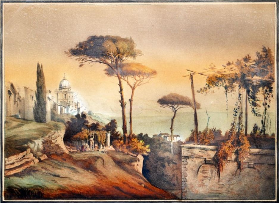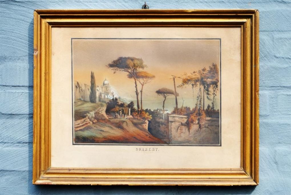 Italiensk kunstner (19. årh.) Parti fra Sorrento. Koloreret litografi.