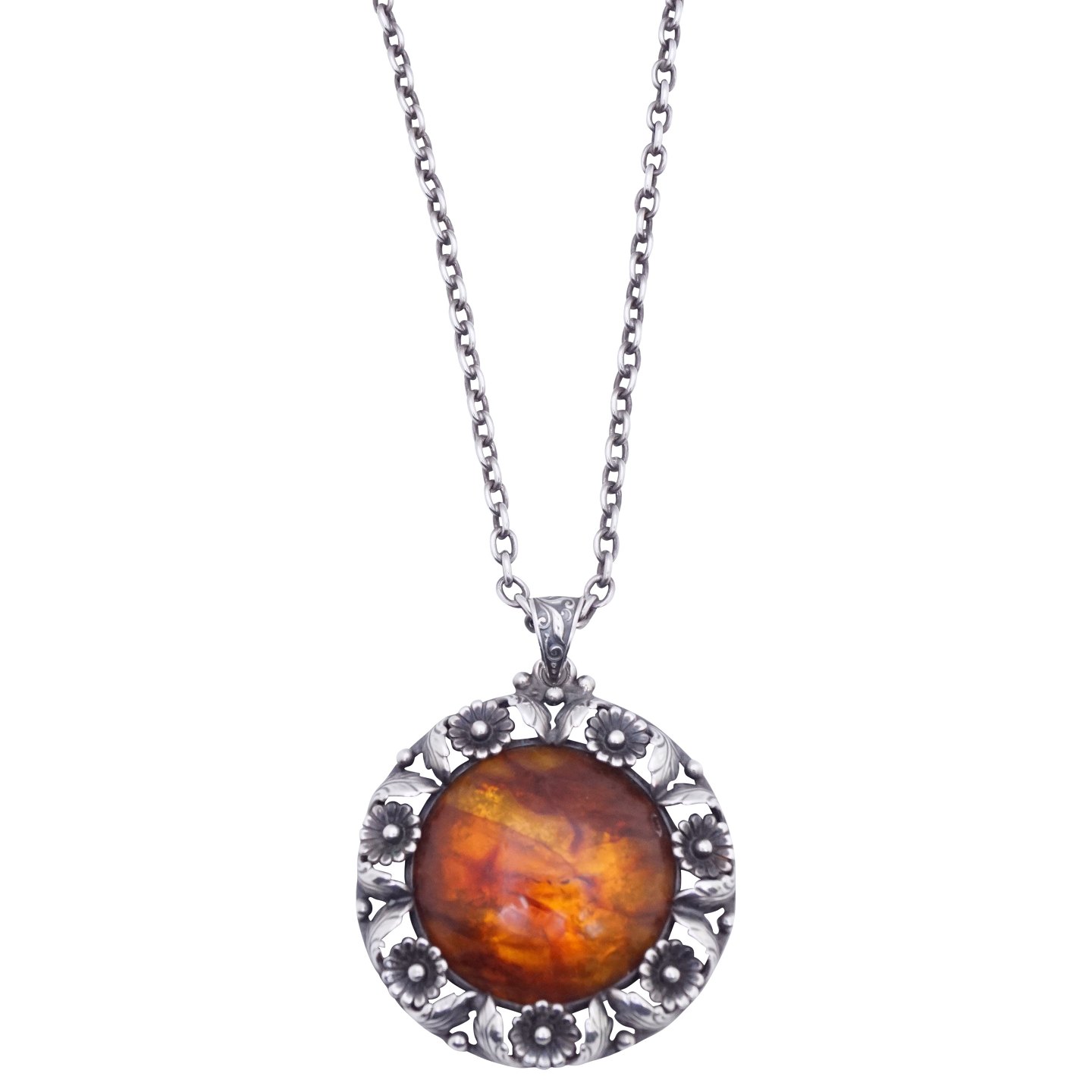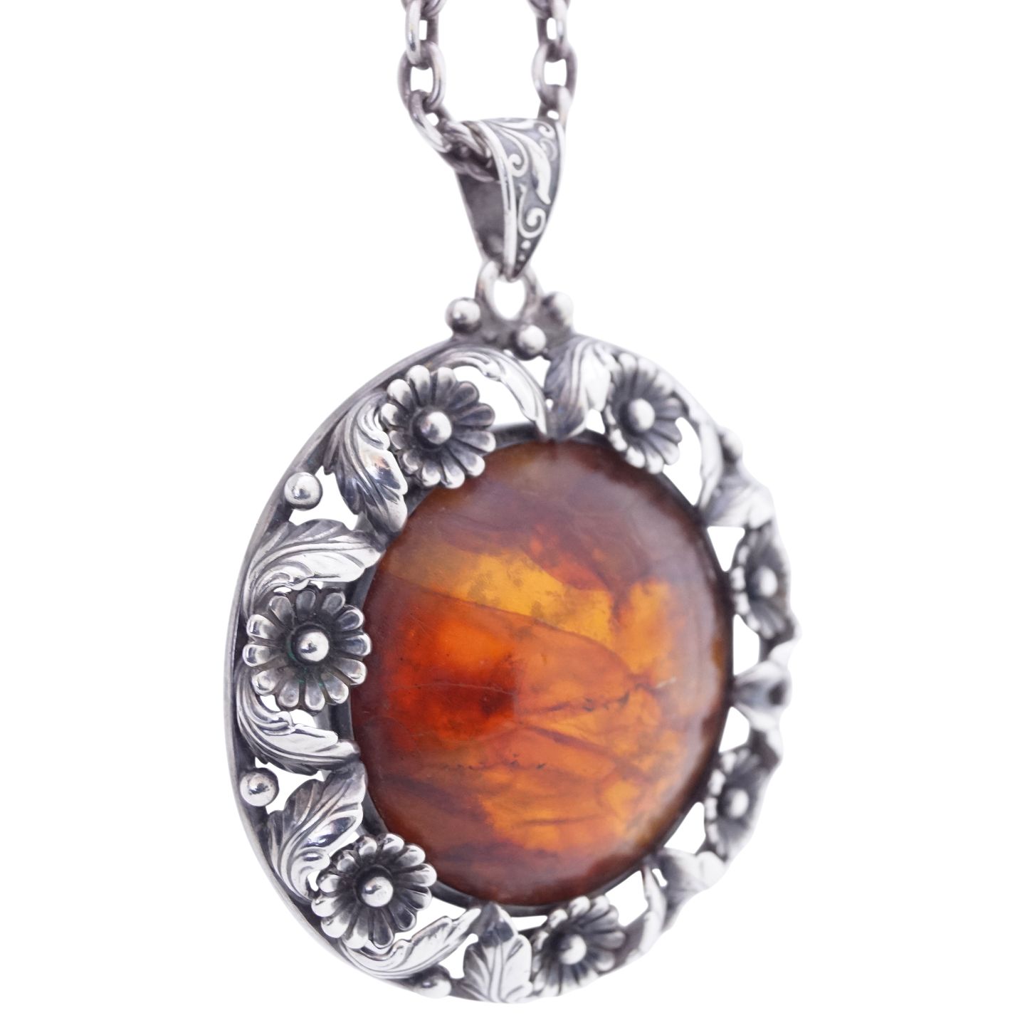 N. E. From; Vedhæng i sterling sølv med rav omkranset af blade og blomster. Diam. 3,5 cm.