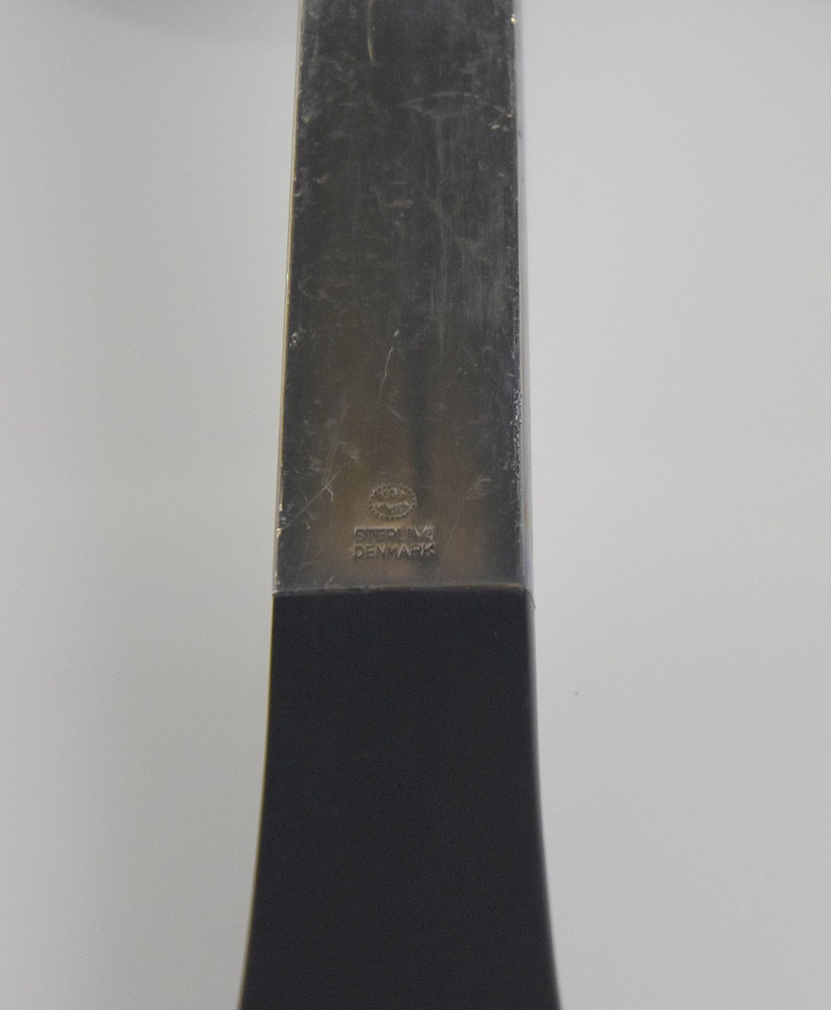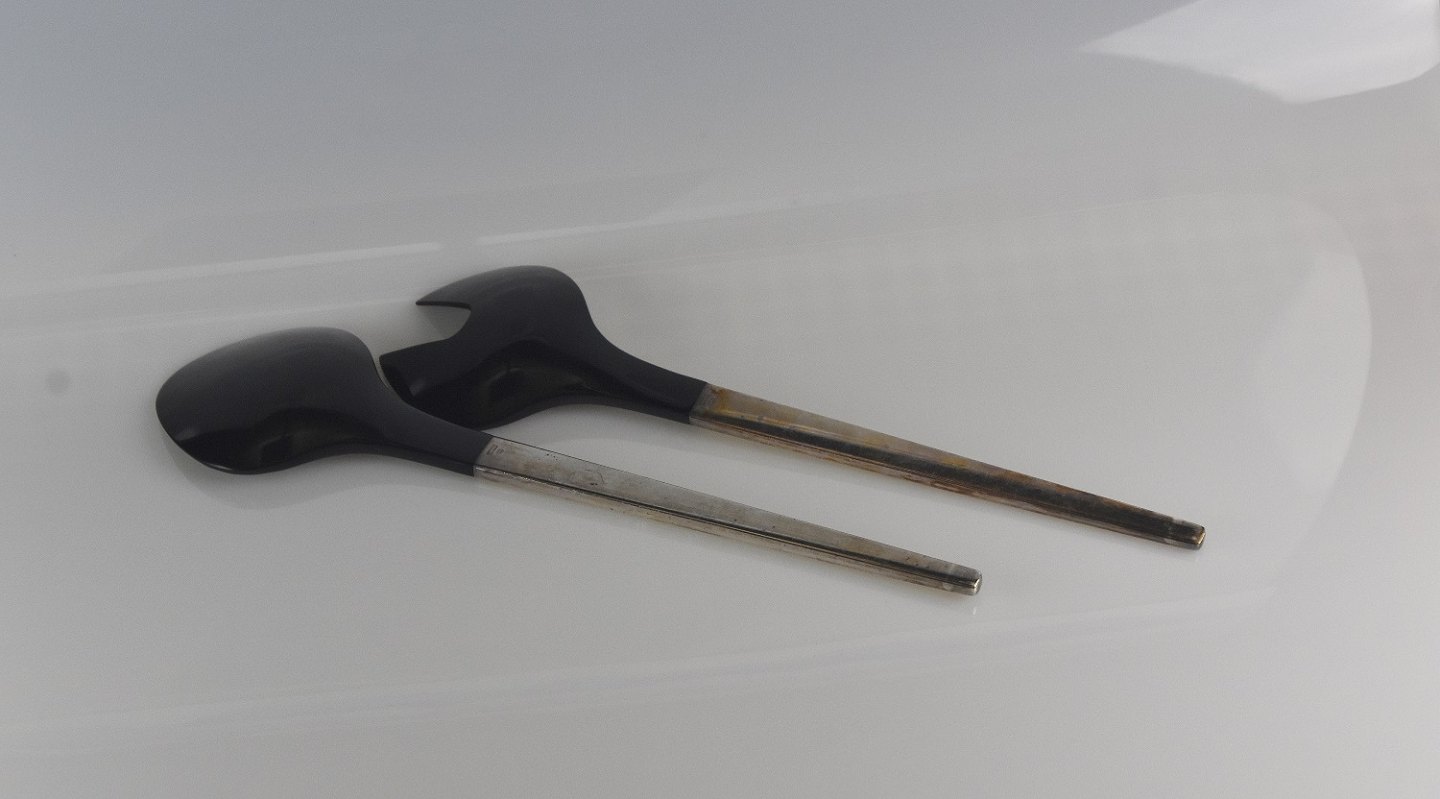 Caravel salatbestik af sterling sølv og sort melamin. Design Henning Koppel, produceret af Georg Jensen. Formgivet 1958. Kommer i original æske. Bestikket har små brugsspor