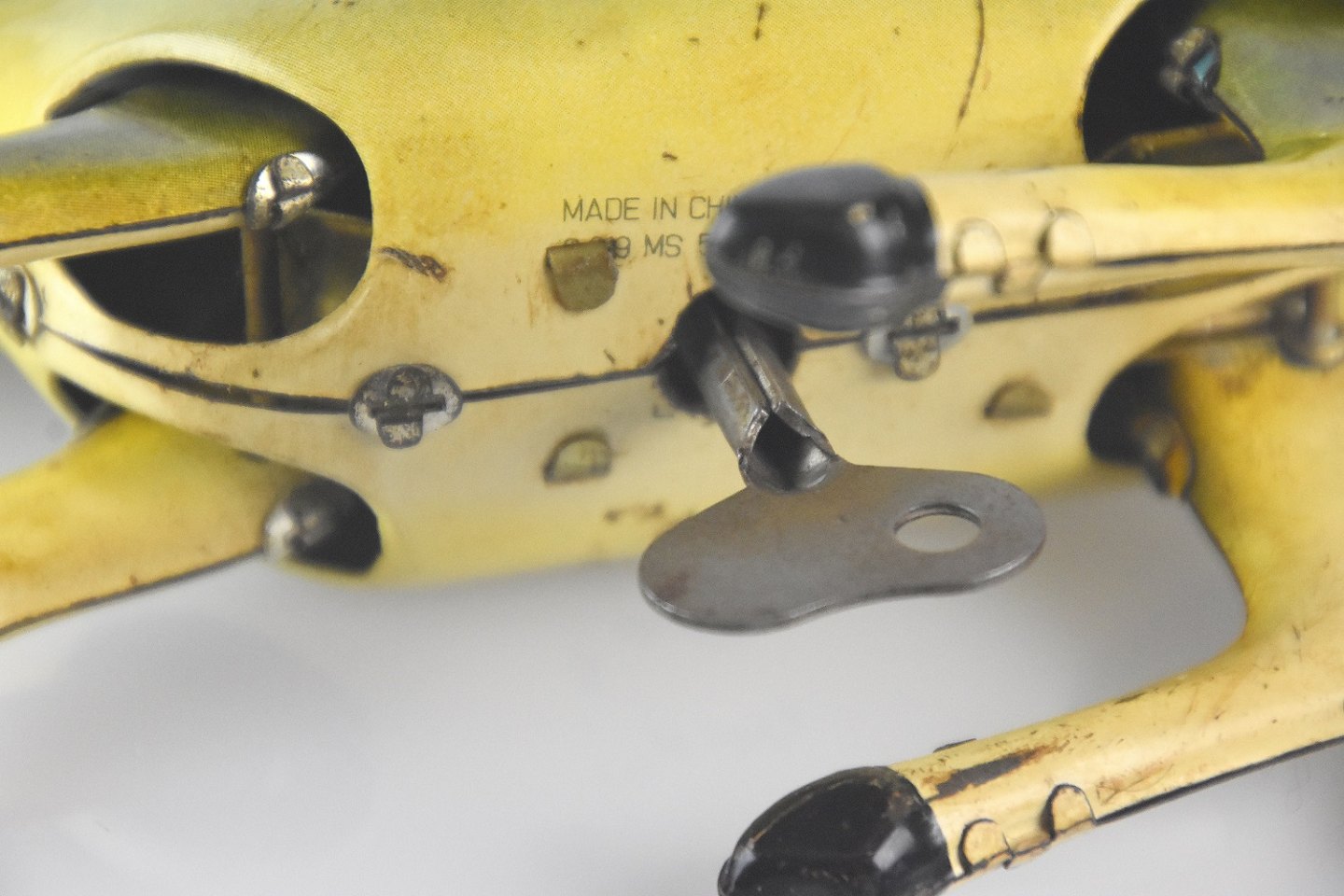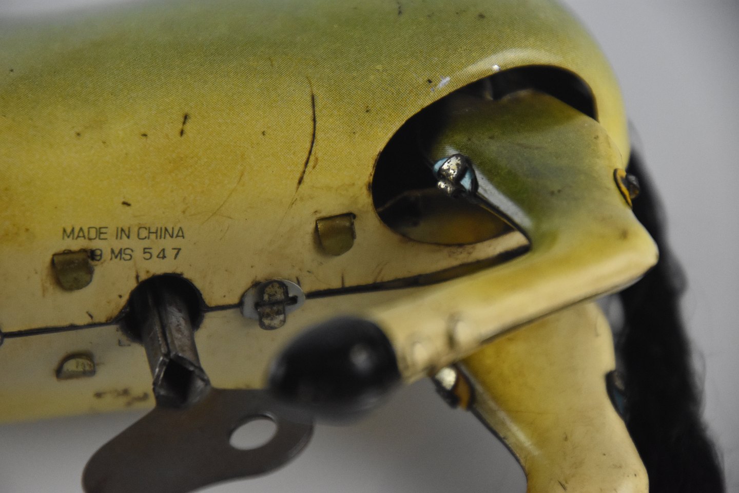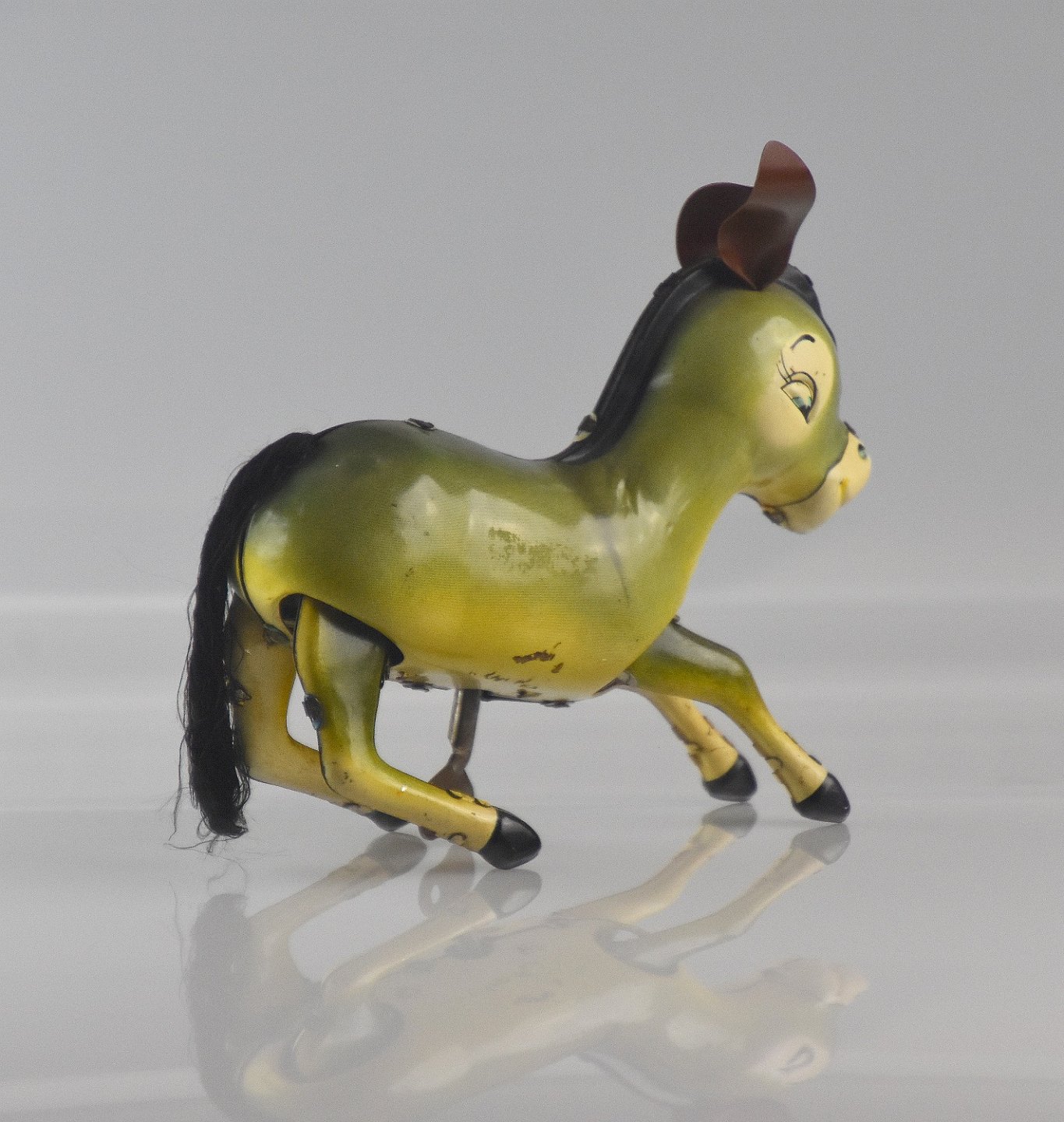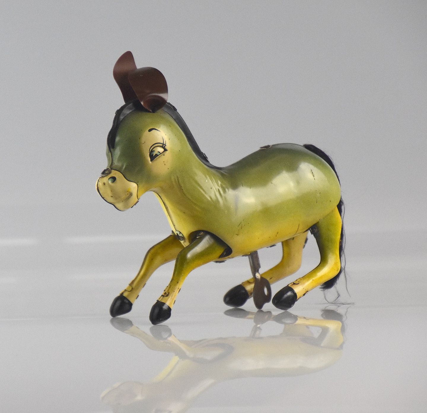 Mekanisk blik legetøjs æsel, æslet er grønligt, ørerne er af plast og manke og hale er af garn. Når æslet bliver trukket op hopper det fremad