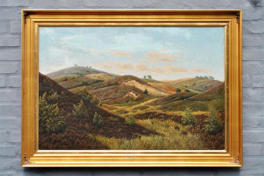 Frederiksen, Laurits (1857 - 1930) Danmark. Præstebakkerne ved Svejbæk. August 1914. Olie på lærred. 64 x 95 cm. Signeret: Laurits Frederiksen 1914.