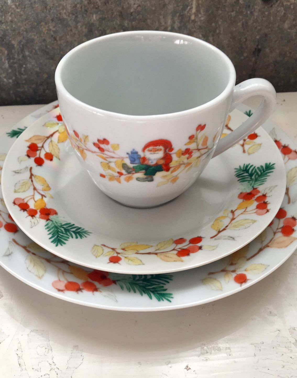 Mads Stage, Julestel med nissemotiv, Kaffekop sæt, 3 dele, Kop 7cm høj, Tallerken 19cm i diameter *Perfekt stand*