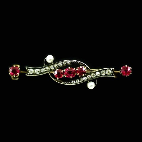 Vintage broche i 14k guld med Turmalin, orientalske perler og diamanter.