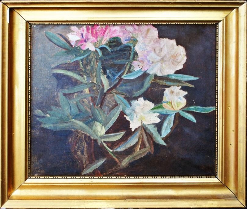 Fynsk kunstner, ca.1900: Blomstrende busk. Olie på lærred. Usigneret. 44 x 49 cm.
