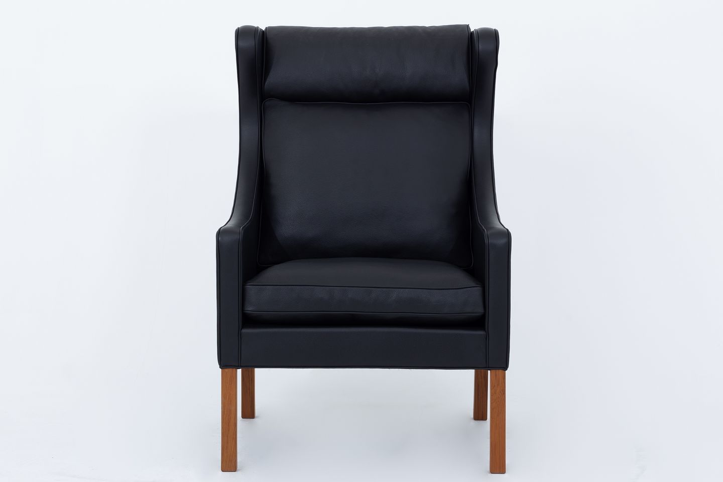 BM 2204 - Nybetrukket øreklapstol med sort Klassik-læder. KLASSIK tilbyder polstring af stolen med stof eller læder efter eget ønske.