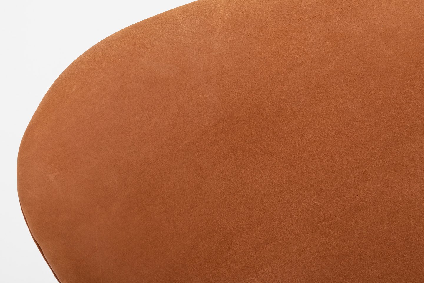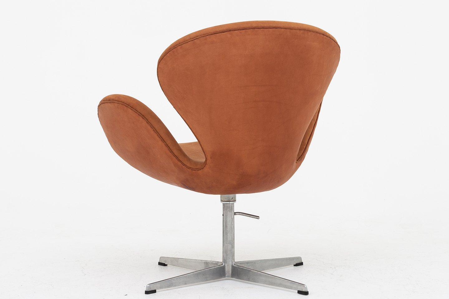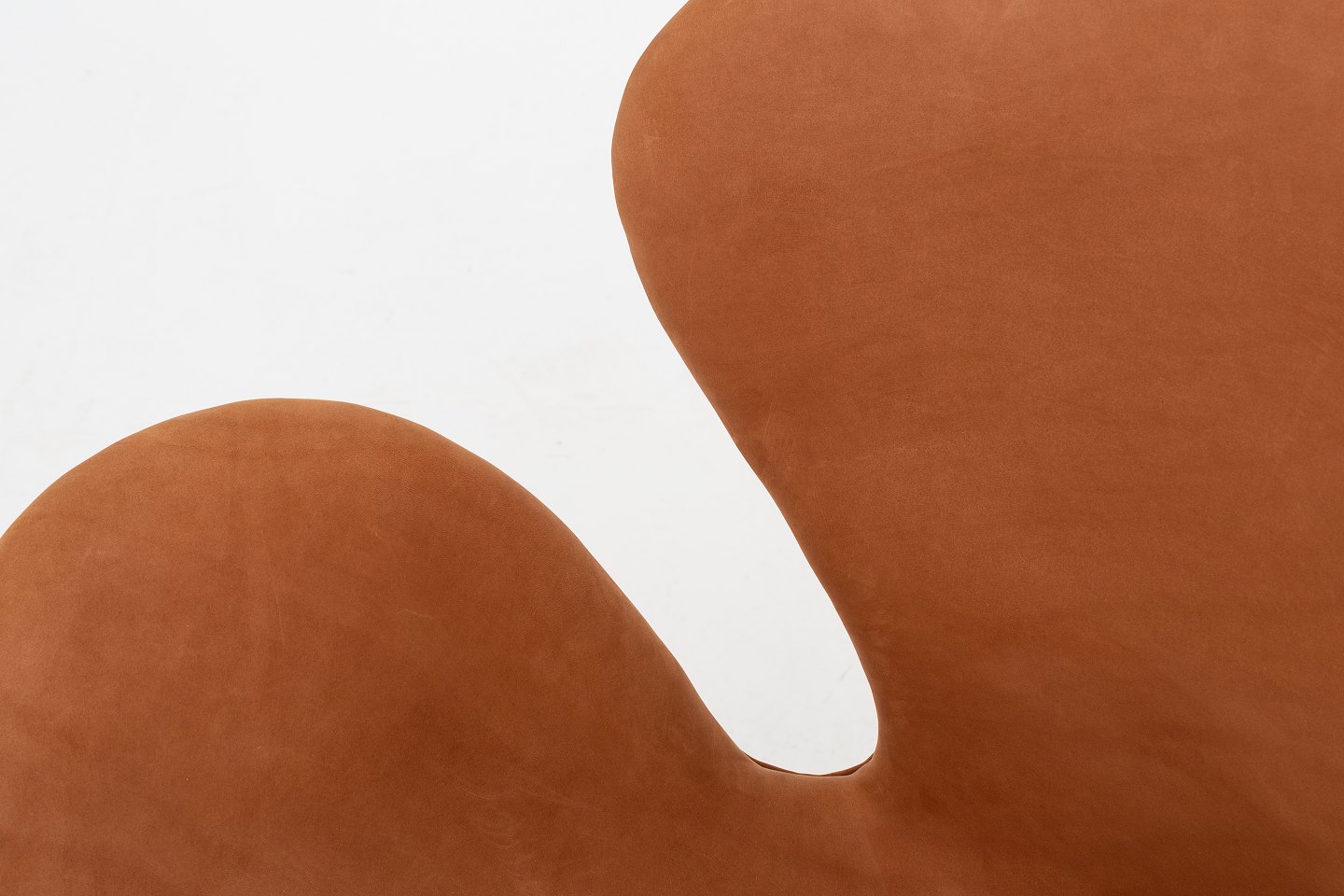 AJ 3320 - Nybetrukket "Svanen" i Dunes Rust-læder på gl. fod og med højdejustering. Vi tilbyder polstring af Svanen med stof eller læder efter eget valg. Kontakt os venligst for mere information.