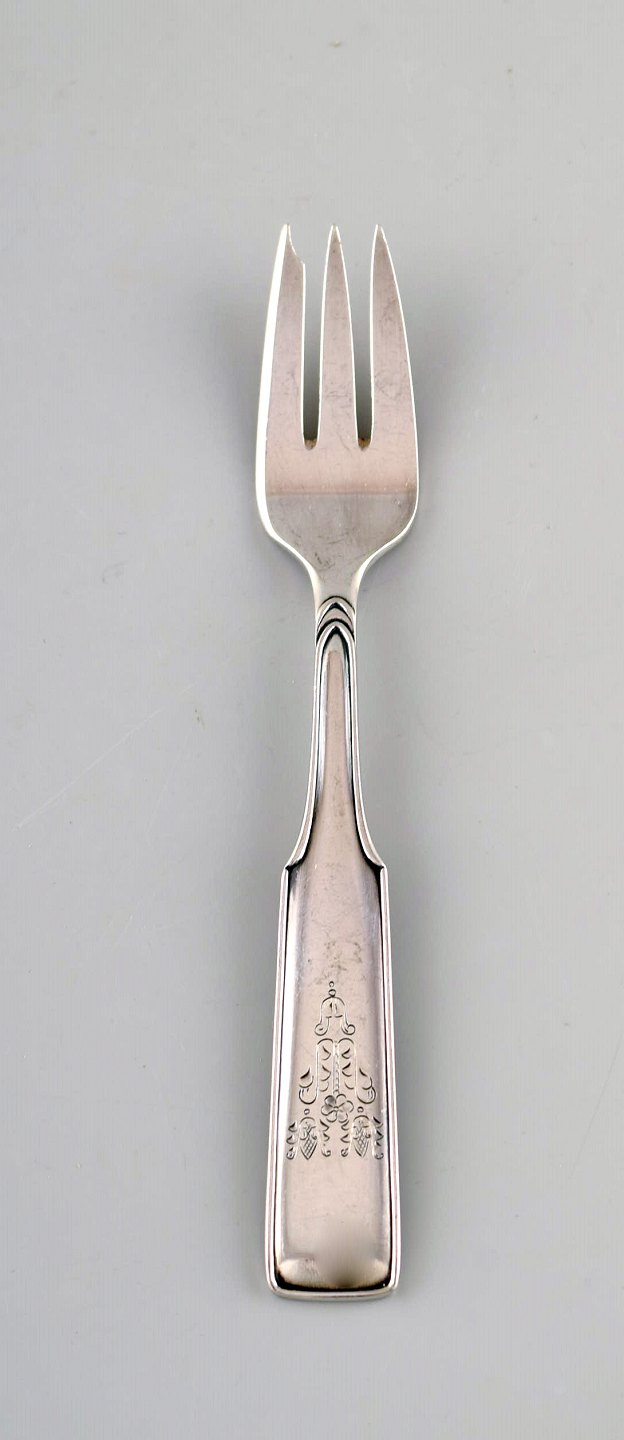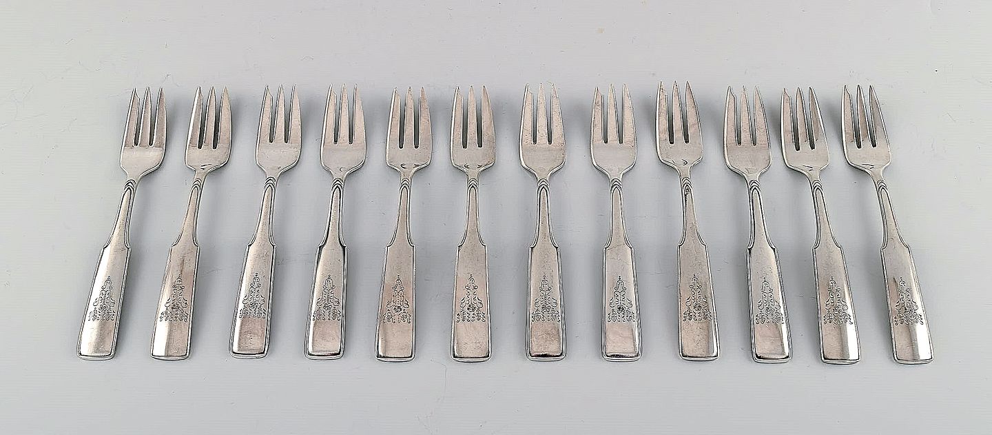 Hans Hansen sølvtøj Arvesølv nr. 2. Sæt på 12 stk kagegafler i 3-tårnet helsølv.