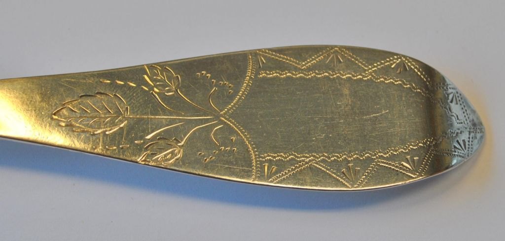 Sølv ske, Christian Haas (1805 - ?) Tønder, Danmark. Stemplet med mestermærke. Med dekorationer. Med inskription: J. H. Petersen - M. Petersen Barsbøl den 18. juni 1878. Længde.: 24 cm.
