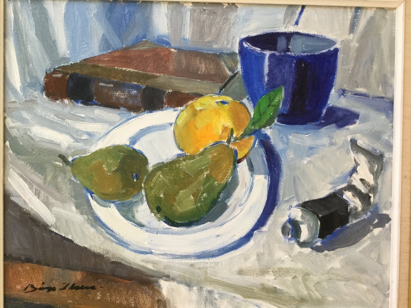 Opstilling på bord med frugt, malertube mv.