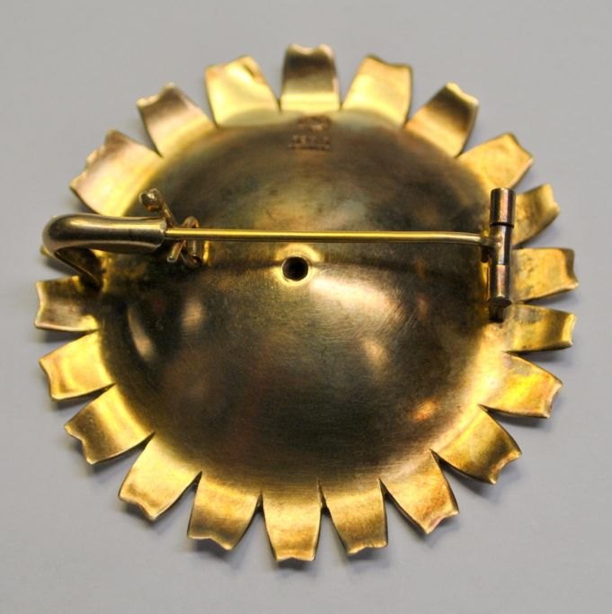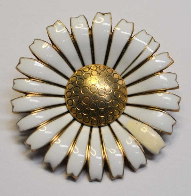 Big Georg Jensen Daisy Brooch / Pendant, 20th Century. Copenhagen, Denmark. Gold plated sterling silver with enamel. Dia: 5 cm. Stamped.