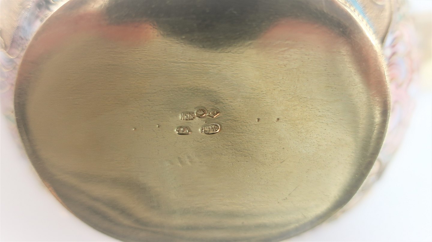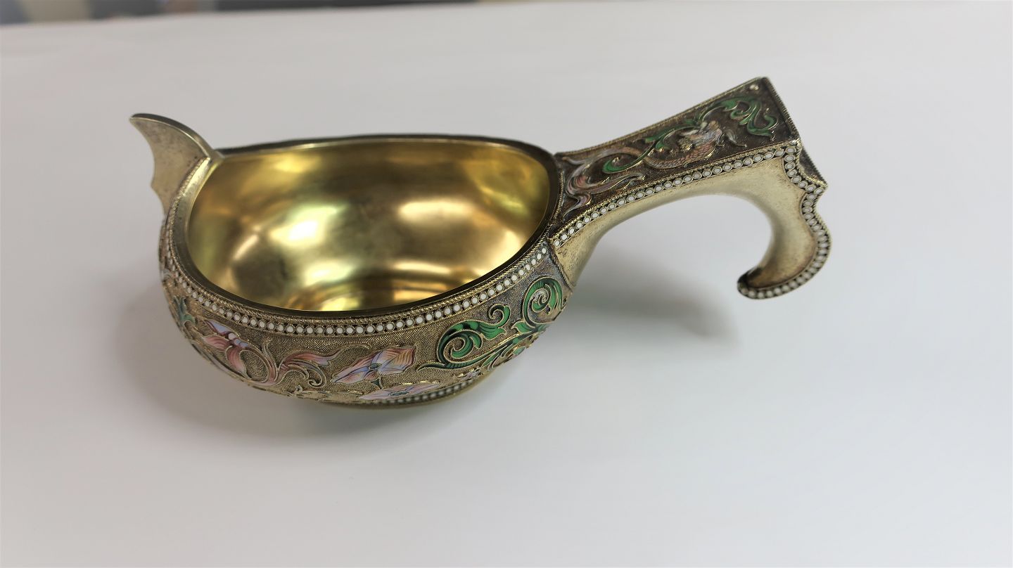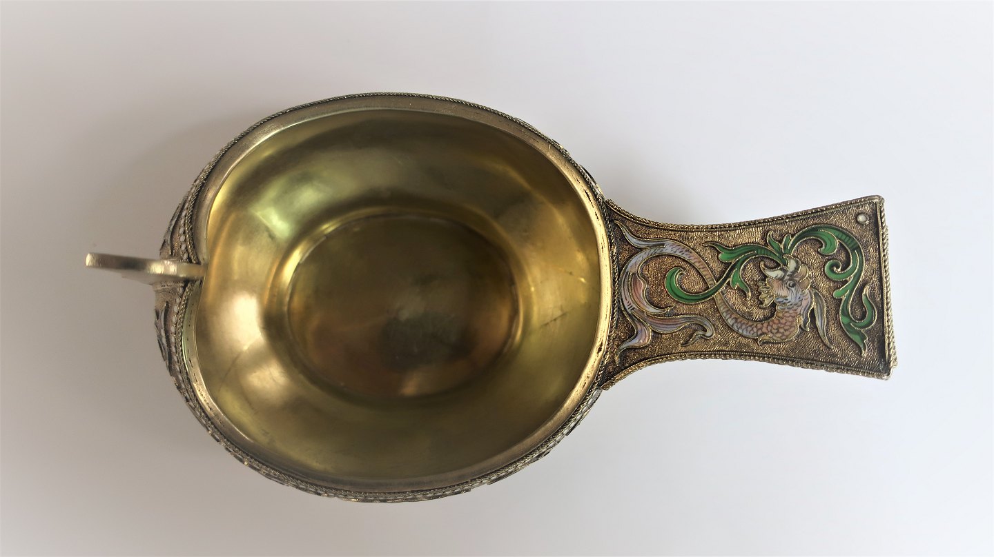 Russisk kovsh af forgyldt sølv, dekoreret med cloisonné emalje. Vasili Agafonov, guardein Ivan Sergeievich Lebedkin i Moskva 1896–1908, lødighed 84, indridset inventarnr. 66147. Yderligere stemplet for A. Tillander og finsk lødighed. Vægt ca. 228 gr. Højde 6,5 cm. Længde 16 cm.