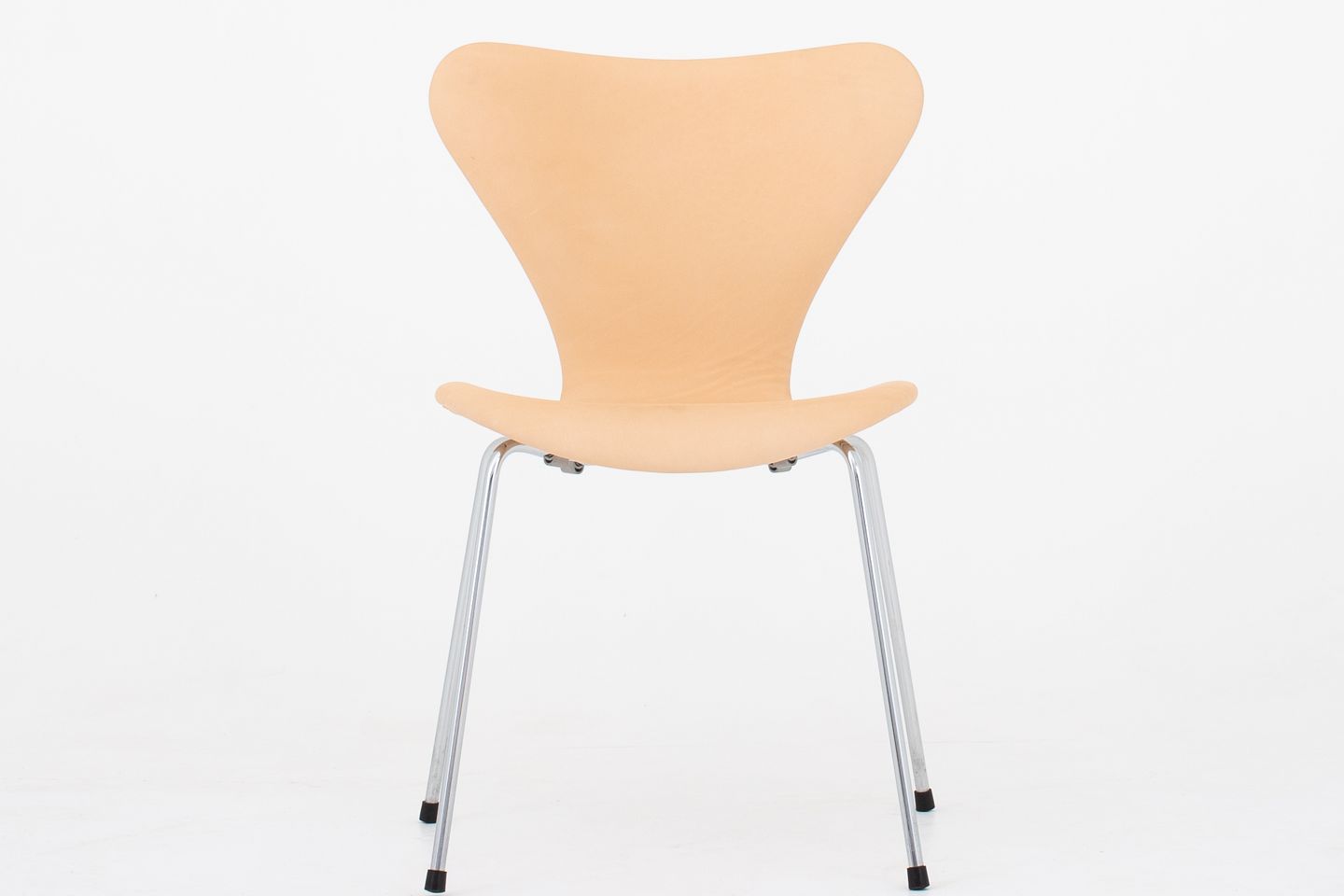 AJ 3107 - Nybetrukket "Syver"-stol i naturlæder med stel i stål. Vi tilbyder polstring af stolen med stof eller læder efter eget valg.