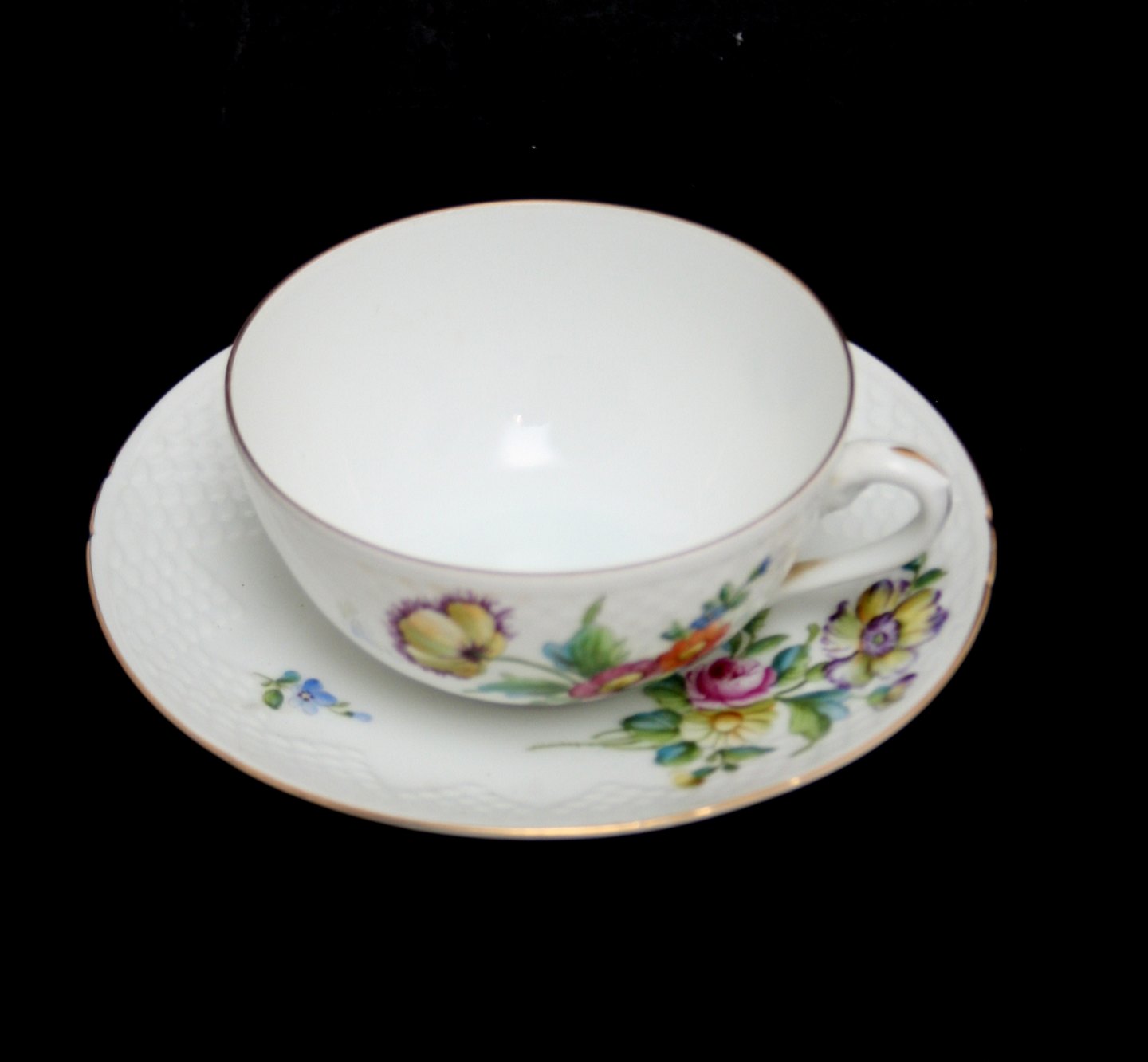Bing & Grøndahl, Saksisk blomst. Tekop med underkop. Nr. 108. Højde 5 cm. Diameter 10 cm. Pris: 225 kr. stk. Lager: 3