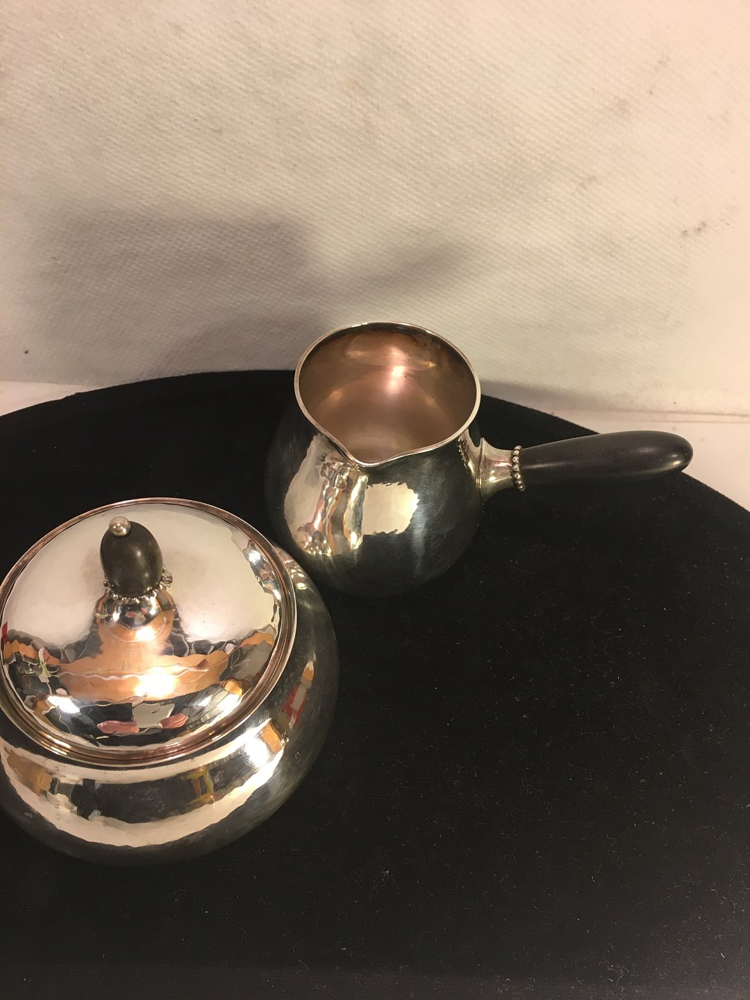 Sukker og flødekande af let hammerslået sterlingsølv 925s , glat buttet korpus, stjerthanke og lågknopper af sort ibenholt. Dessin 80 A.