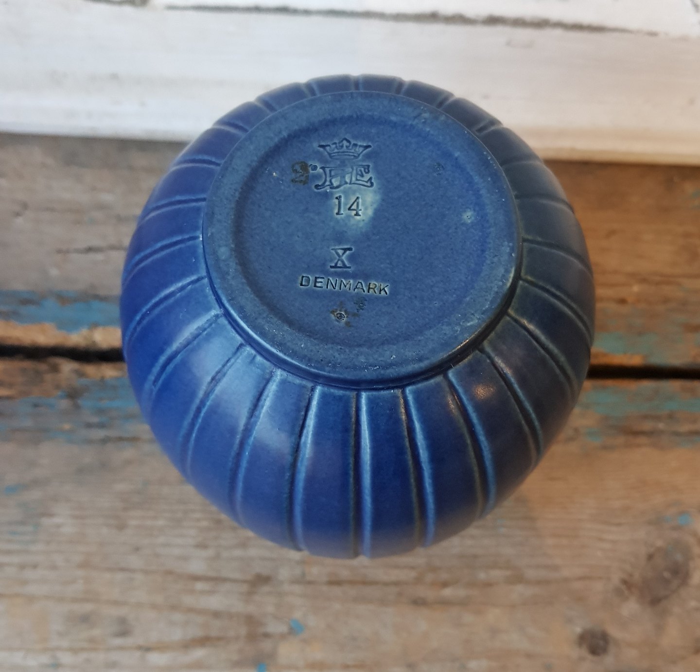 Ipsens enke riflet vase med blå glasur 14 cm.