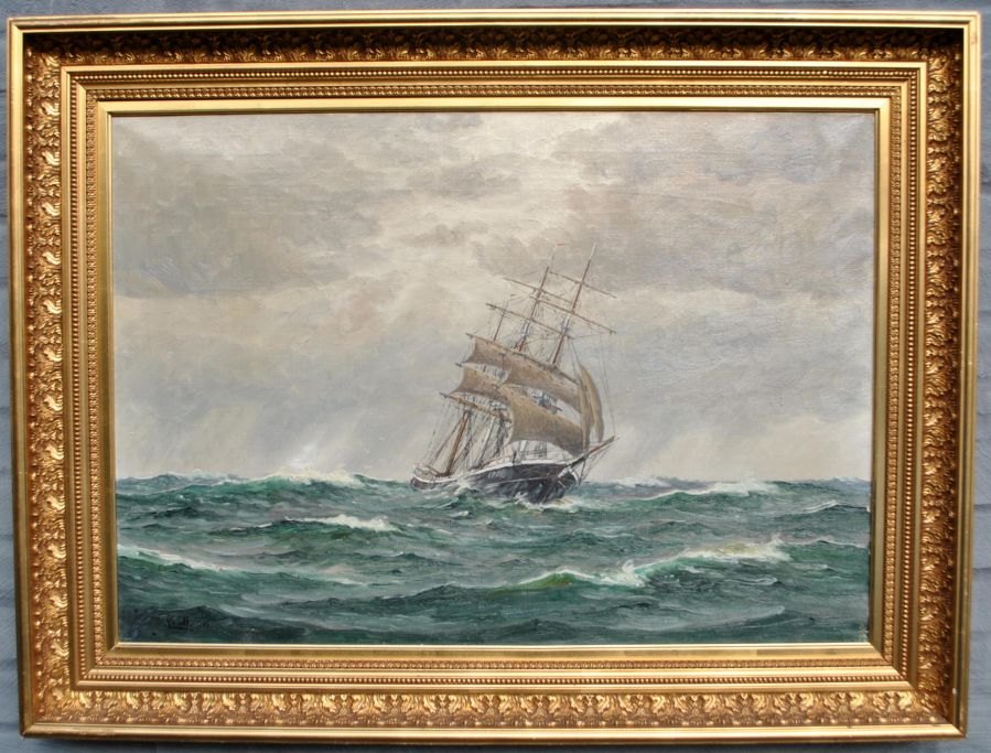 Landt, Frants (1885 - 1975) Danmark: Marine med sejlskib. Olie på lærred. Signeret: Fr. Landt 1949. 56 x 80 cm.