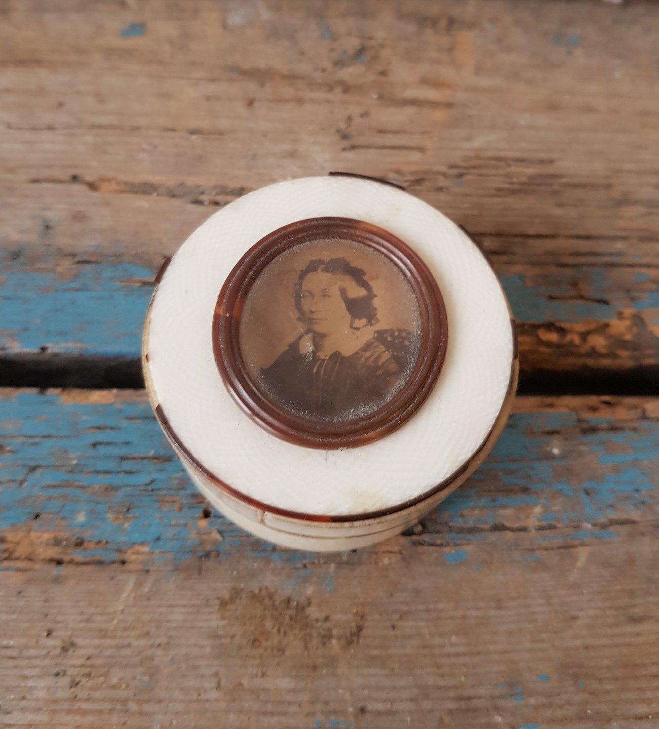 Victoriansk lågdåse i ben og skildpadde forsynet med medaljon på lågets top.