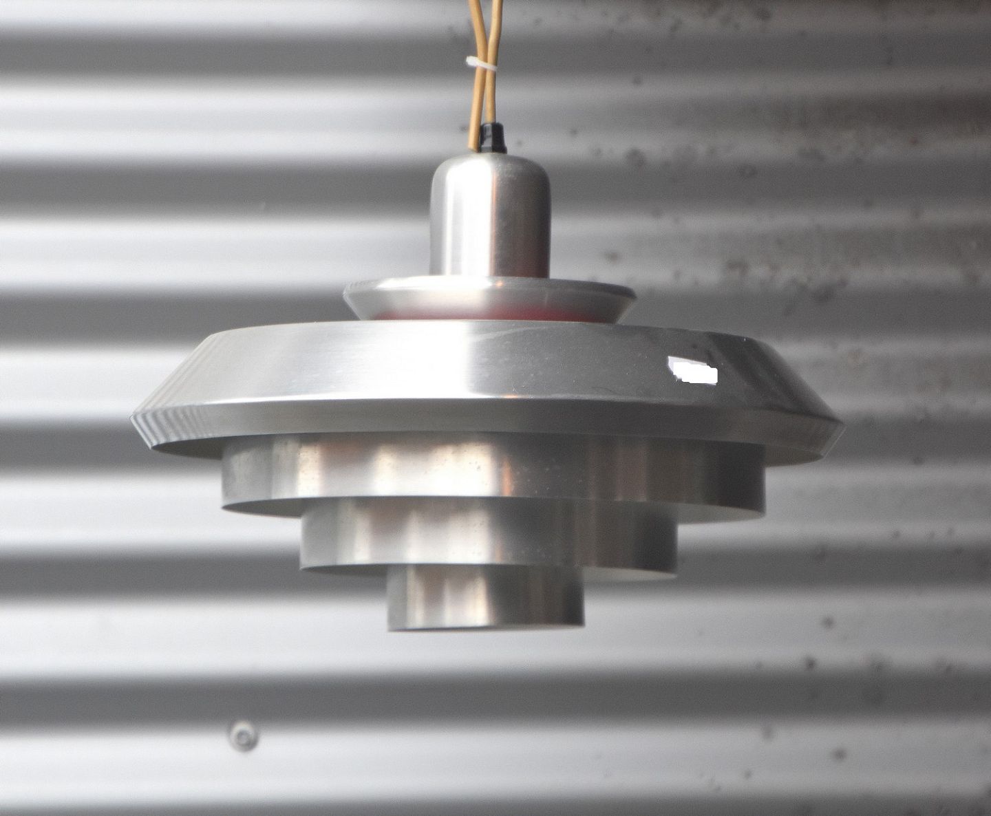 Mat sølvfarvet pendel, hvidmalet indvendig, dog er der lidt rødt i toppen
