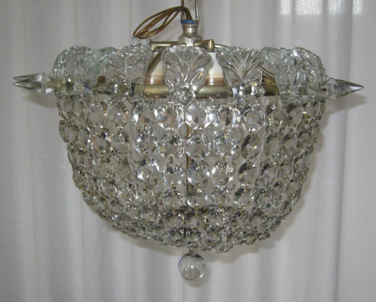 Large sack-shaped prism crown, Denmark, approx. 1900. For 3 lights, with 35 chains and palmettos. A total of 470 prisms. Dia: 48 cm. H: 40 cm. Beautiful condition.