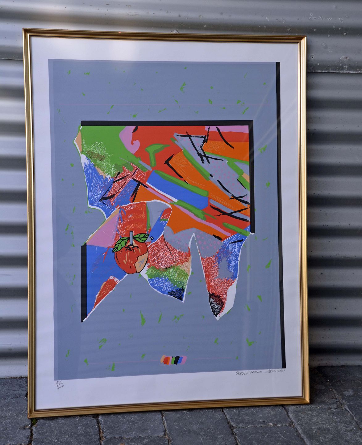 Litografi med abstrakt motiv i blå, grønne og røde nuancer af Preben Franck Stelvig