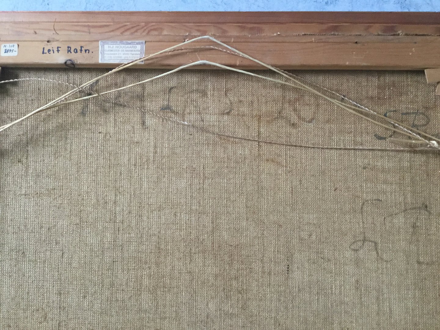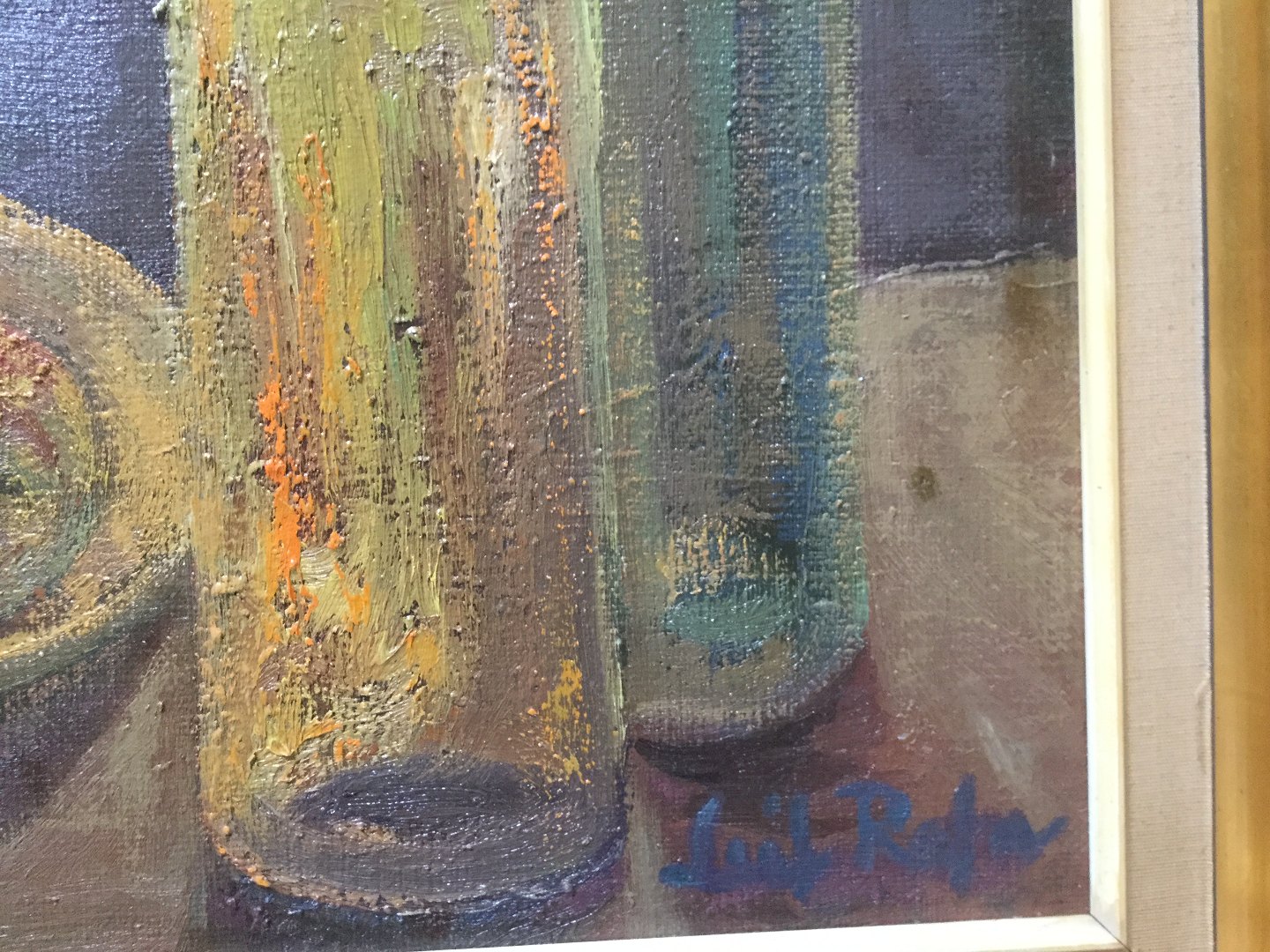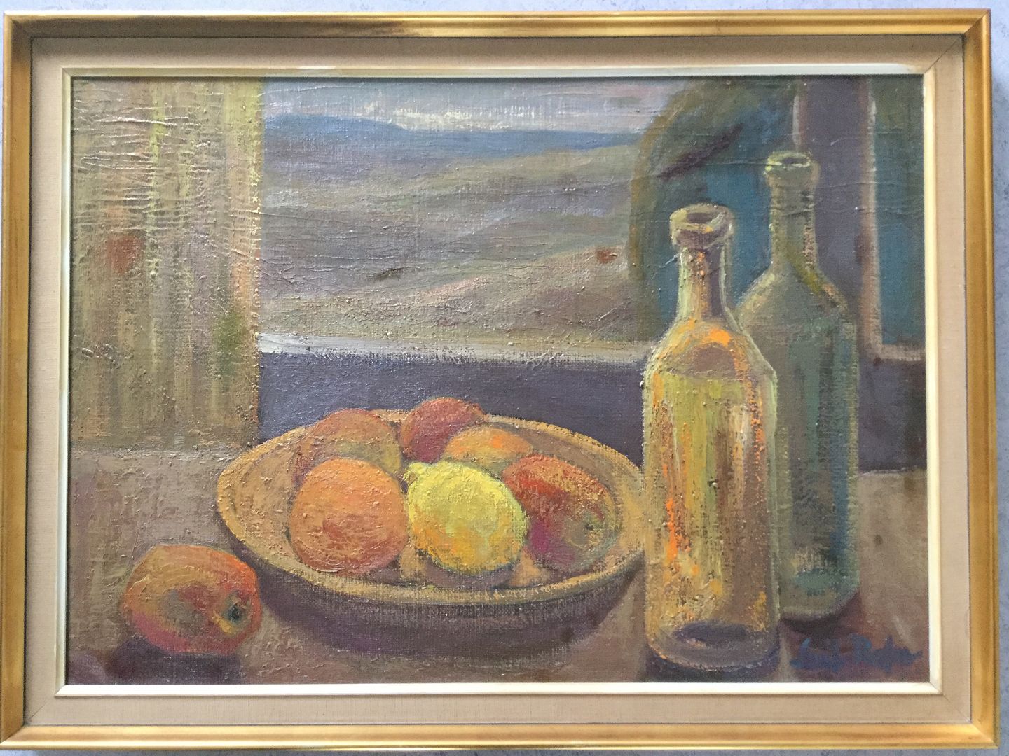 Maleri af Leif Rafn - Opstilling ved vindue med flasker og frugt .