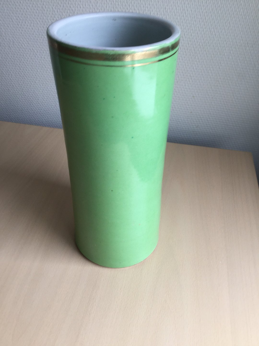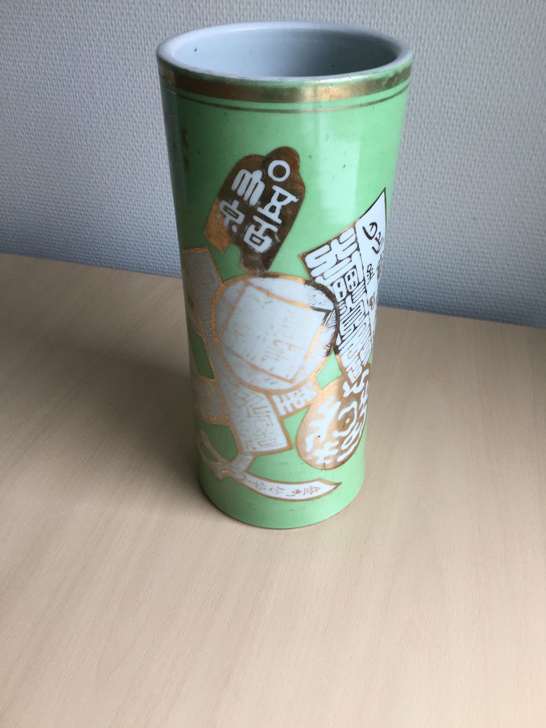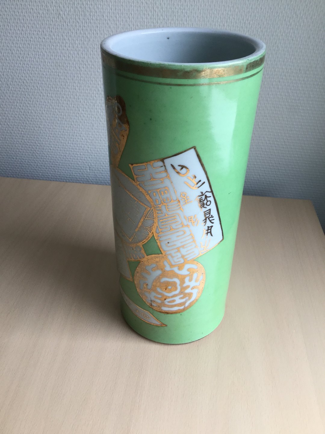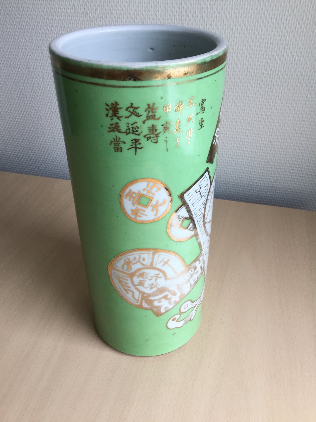Hatstand vase med guld dekoration og resedagrøn fond.