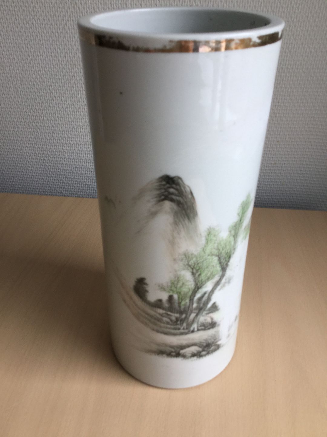 Text available in Danish: Hatstand vase dekoreret med landskab og guldkant.