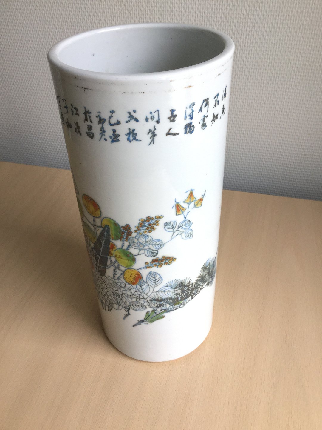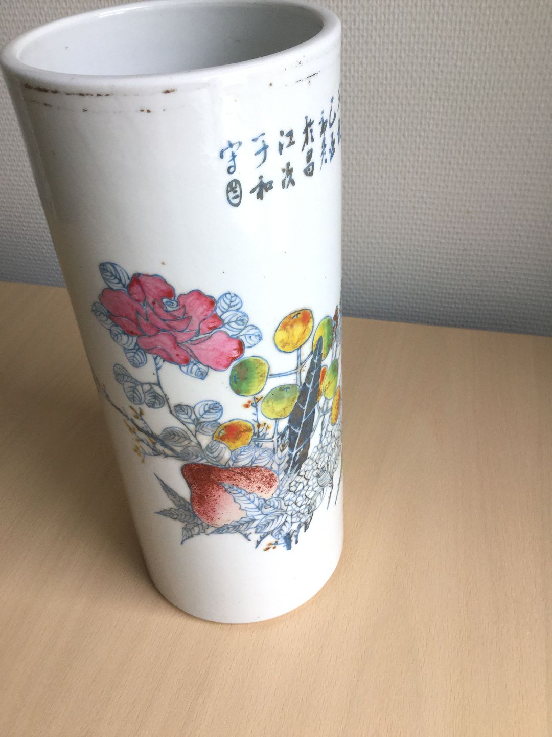 Text available in Danish: Hatstand vase dekoreret med blomster, frugt og skriftstegn.
