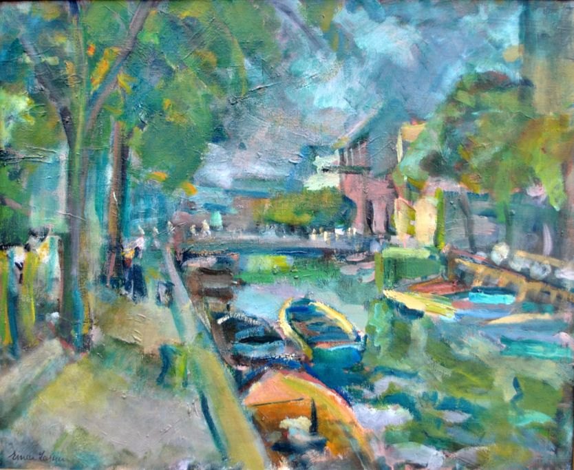 Larsen, Ejnar R. (1902 - 1986) Danmark: Kanal scene, København. Signeret: Ejnar Larsen. Olie på lærred. 81 x 101 cm.