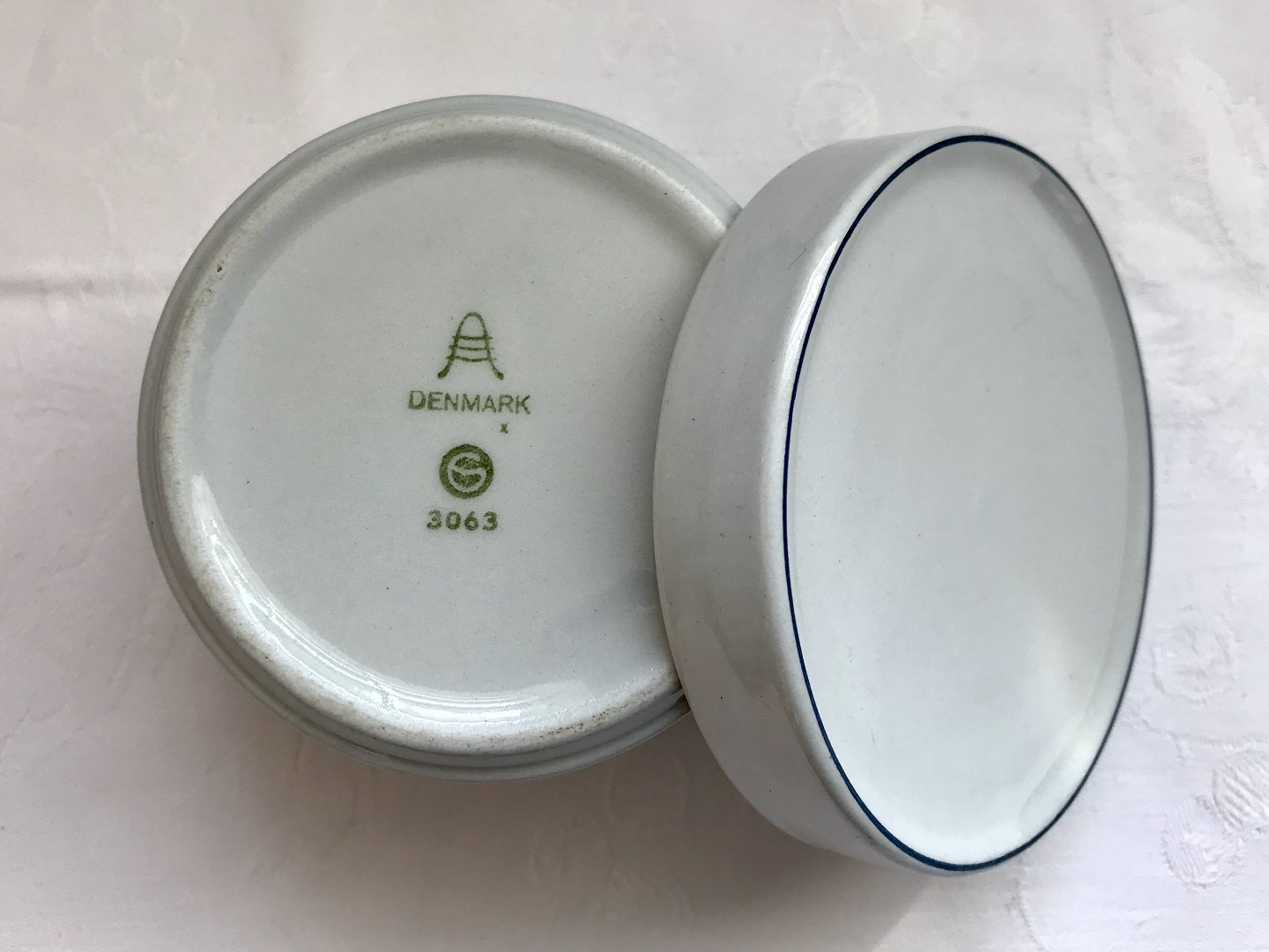 | Royal Copenhagen, Aluminia, Blå kant, Lågkrukke #3063, 6,5cm høj, 9cm i diameter, 1.Sortering, Design Grethe Meyer *Pæn stand*