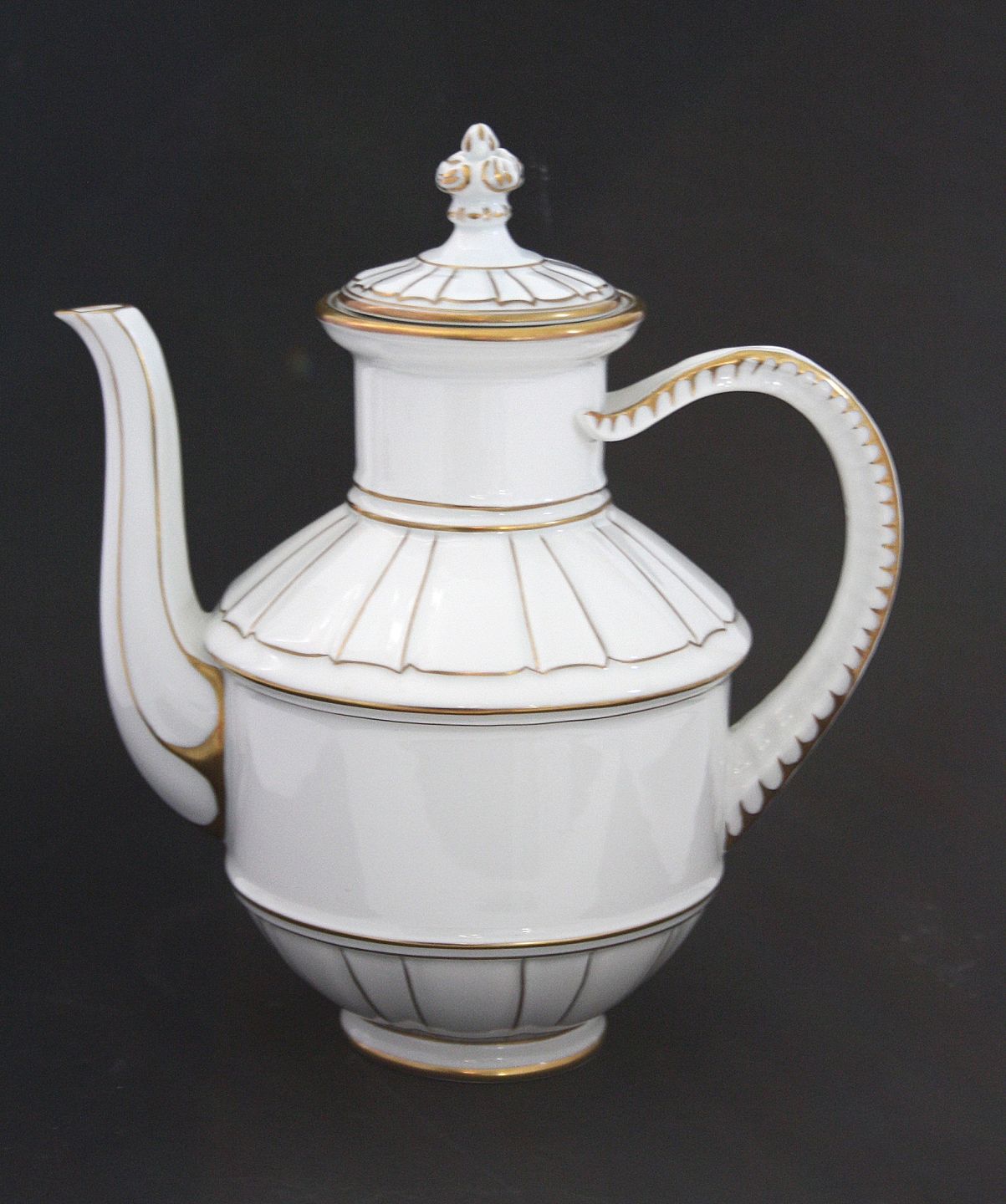Bing & Grøndahl, Offenbach, kaffekande 26 cm. Hvidt kantet porcelæn med guldkant. Pris: 250 kr.
