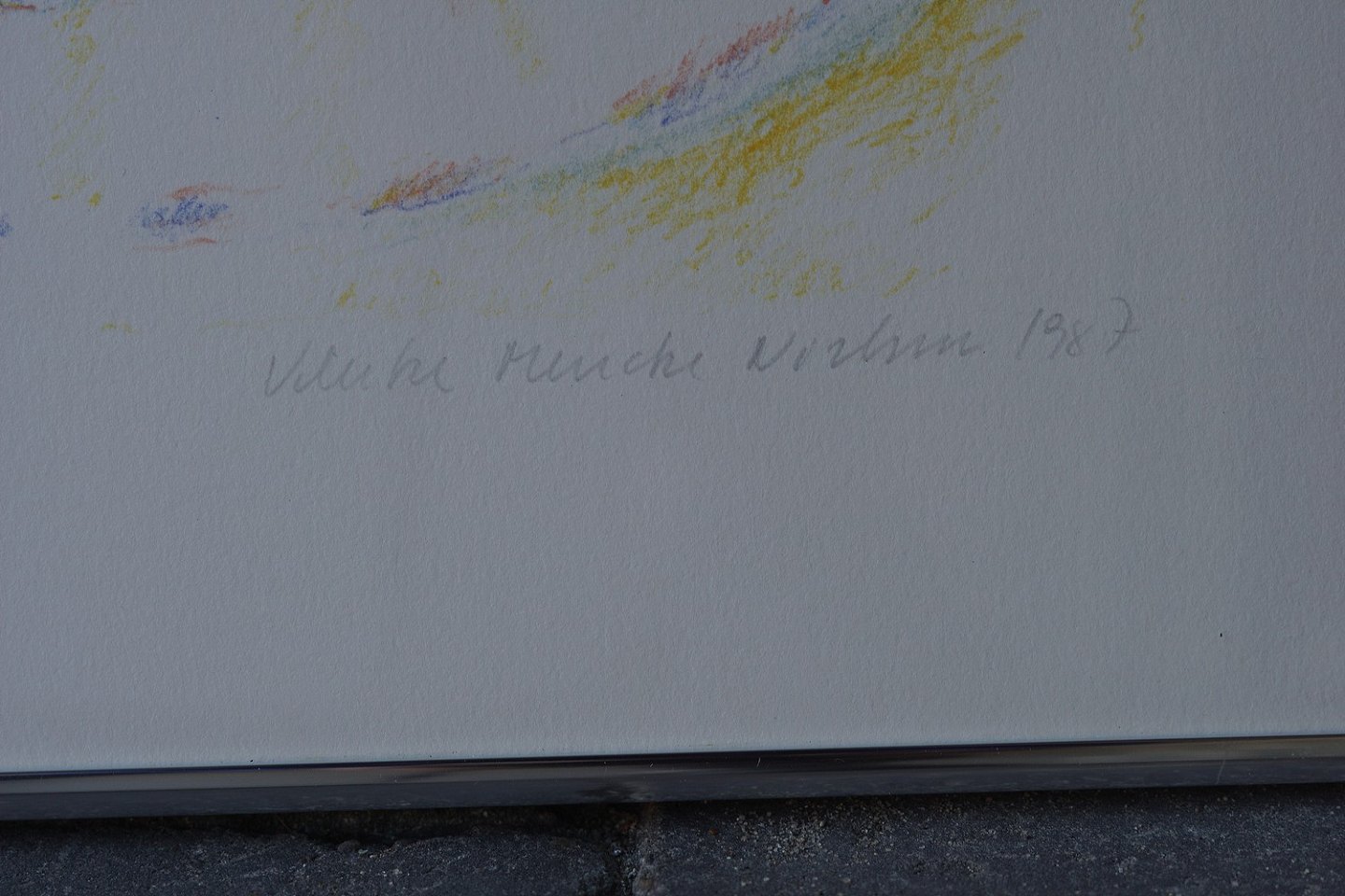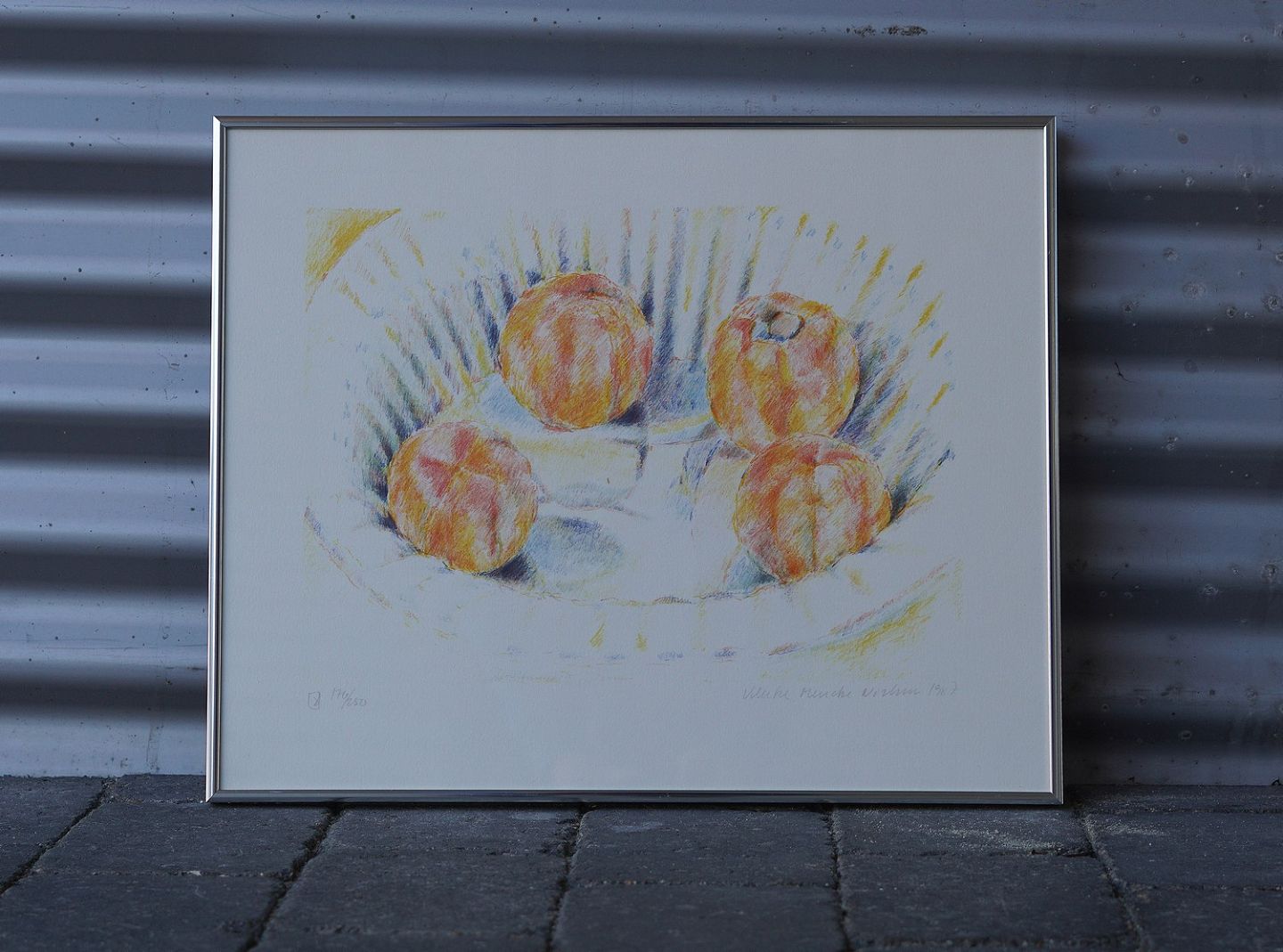 Litografi med frugter, nr.: 170/250. På bagsiden er der en beskrivelse af Vibeke Mencke-Nielsen