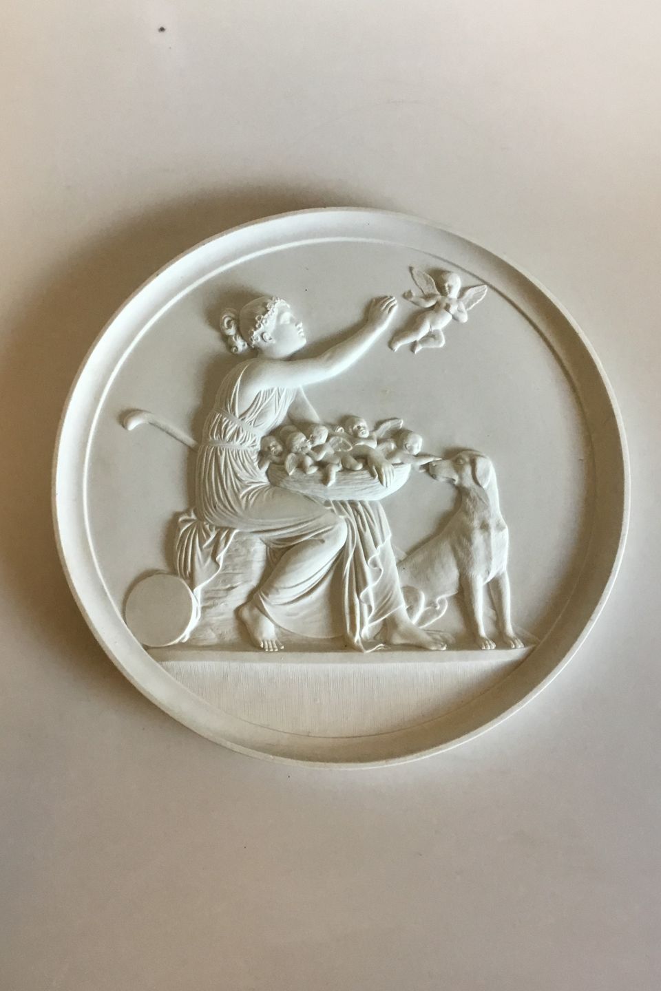 Royal Copenhagen Biscuit Platte "Hyrdinde med en Amorinerede". No 110. Kopi af Christian Christensen fra 1845 after Thorvaldsens original fra Rom 1831. Måler 35 cm (13.77 inch).