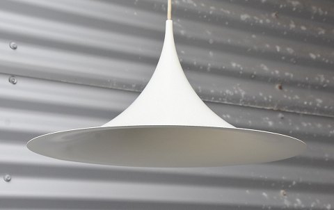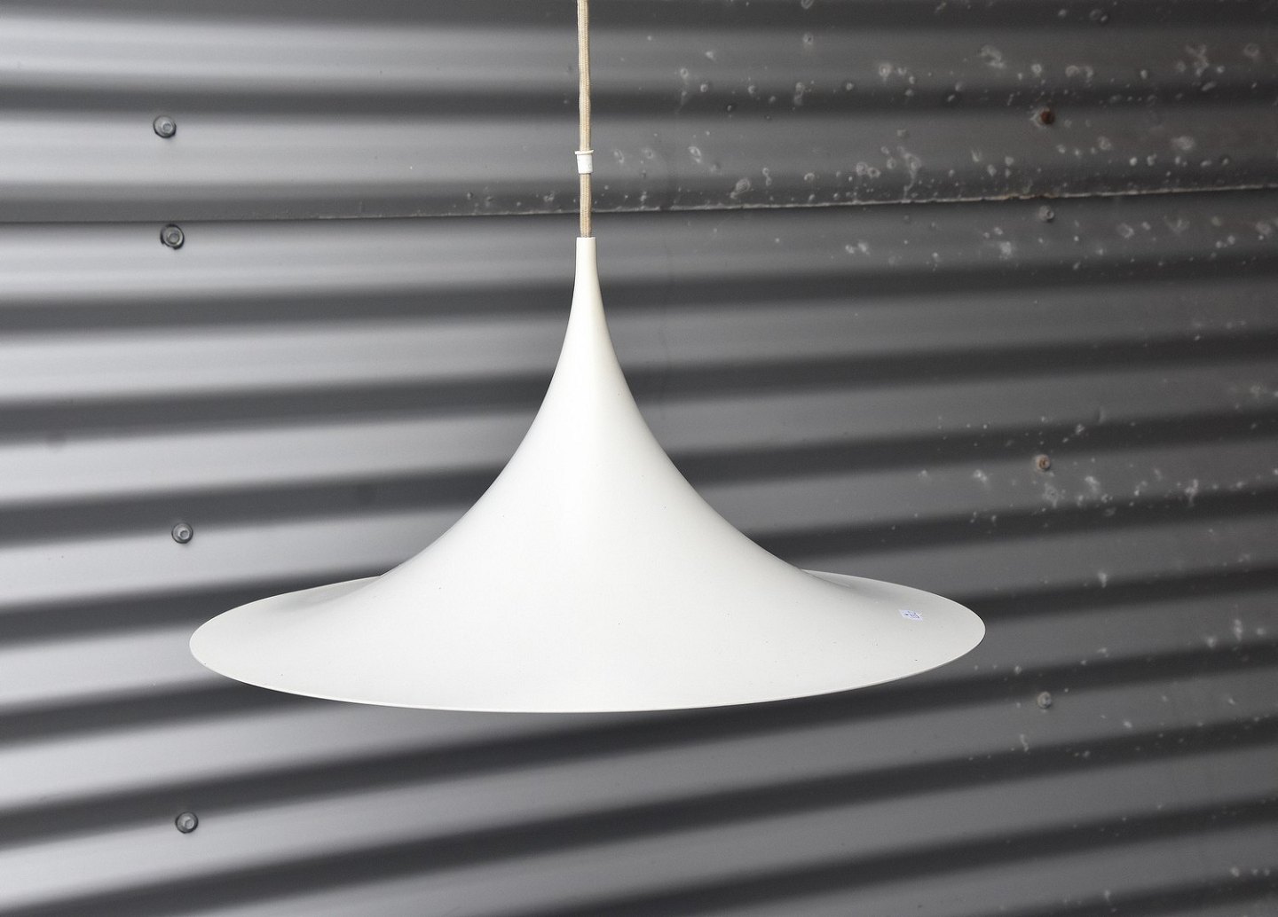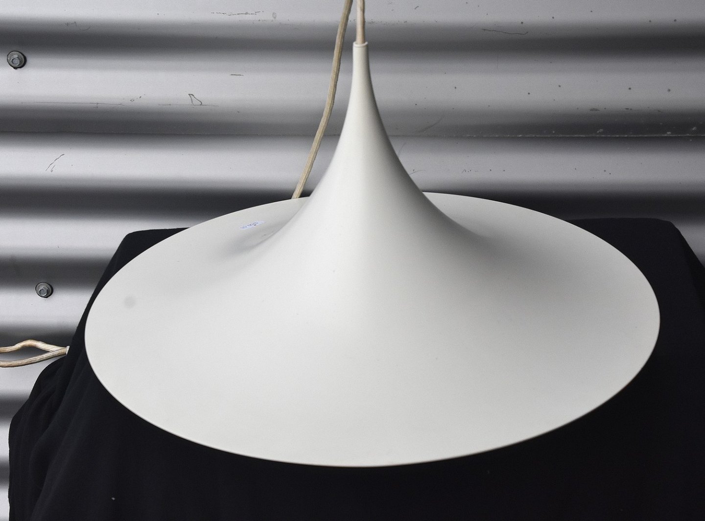 Høj hvid pendel, trompetlampe, semi-pendel. Dansk Vintage Design. Pendlen er lavet af metal