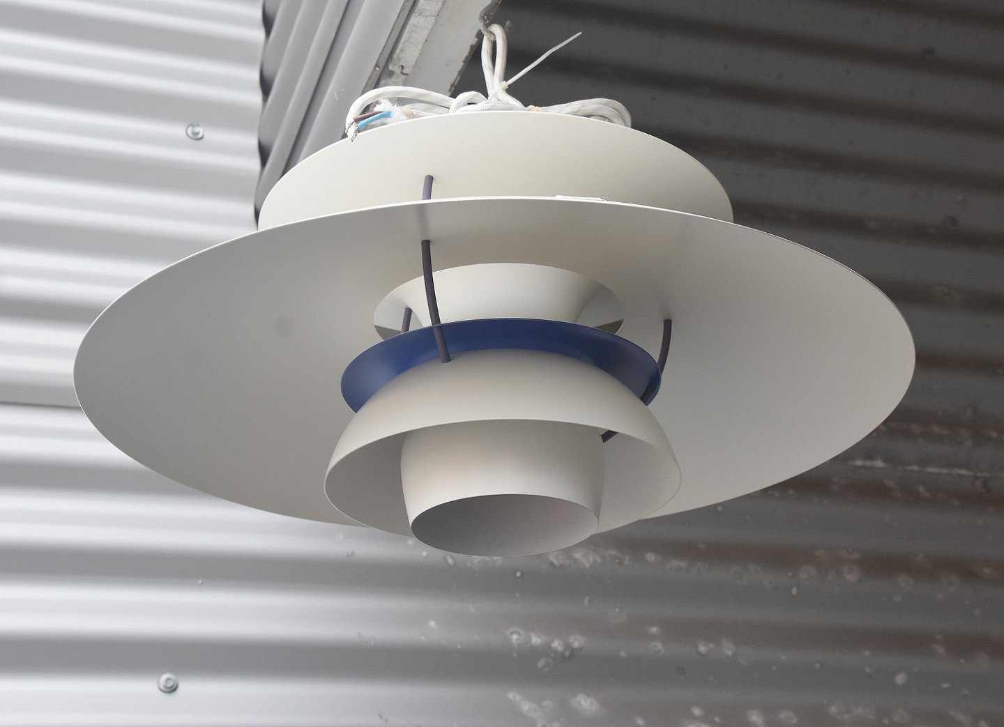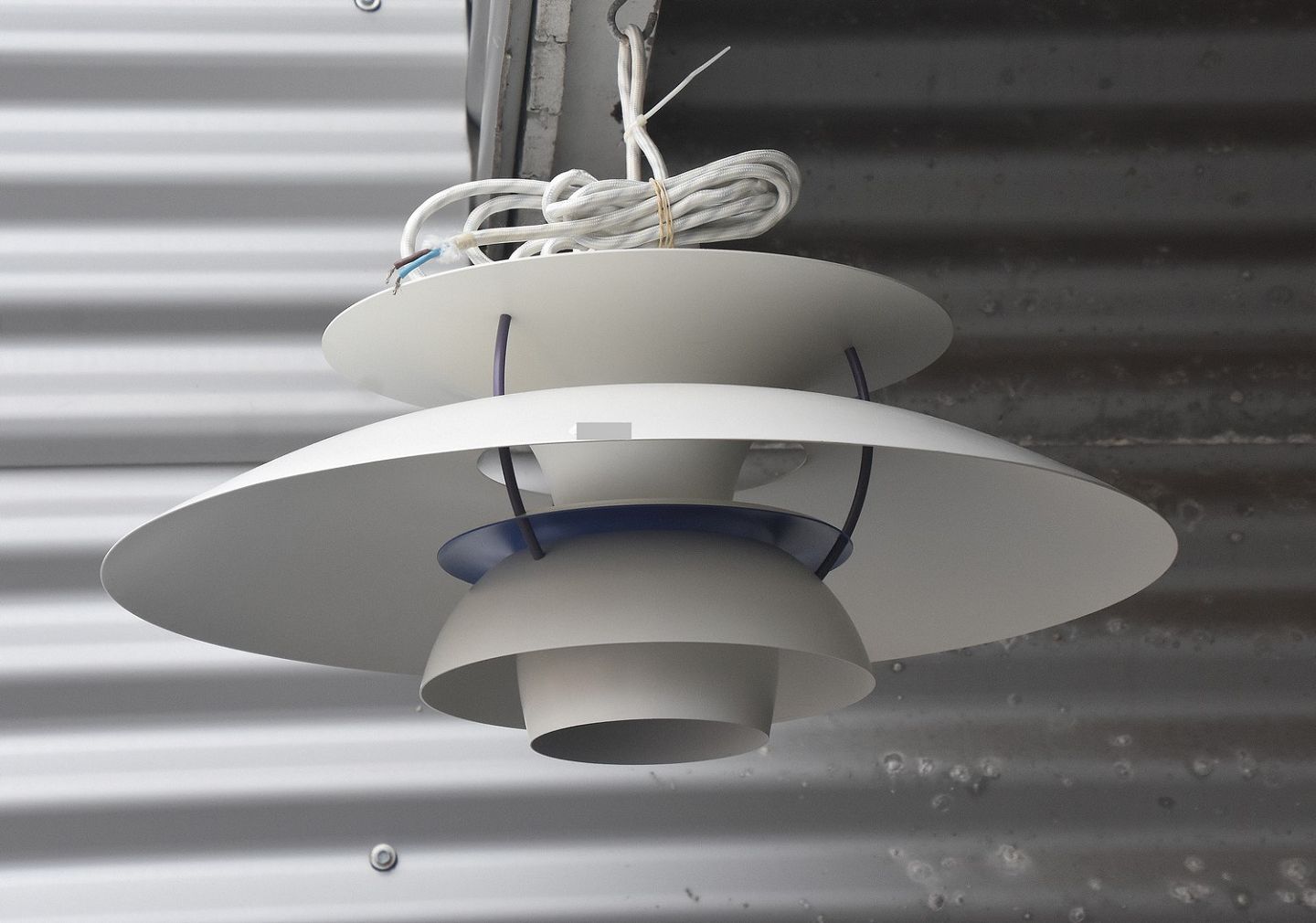 PH5 pendel med hvid yderskærm og blå/lilla inder skærm.