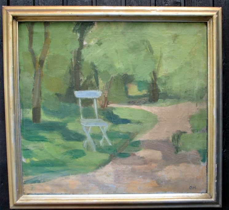 Markussen, Olaf (1912 - 1995) Danmark: En stol i en park. Signeret monogram. Olie på lærred. 60 x 68 cm.