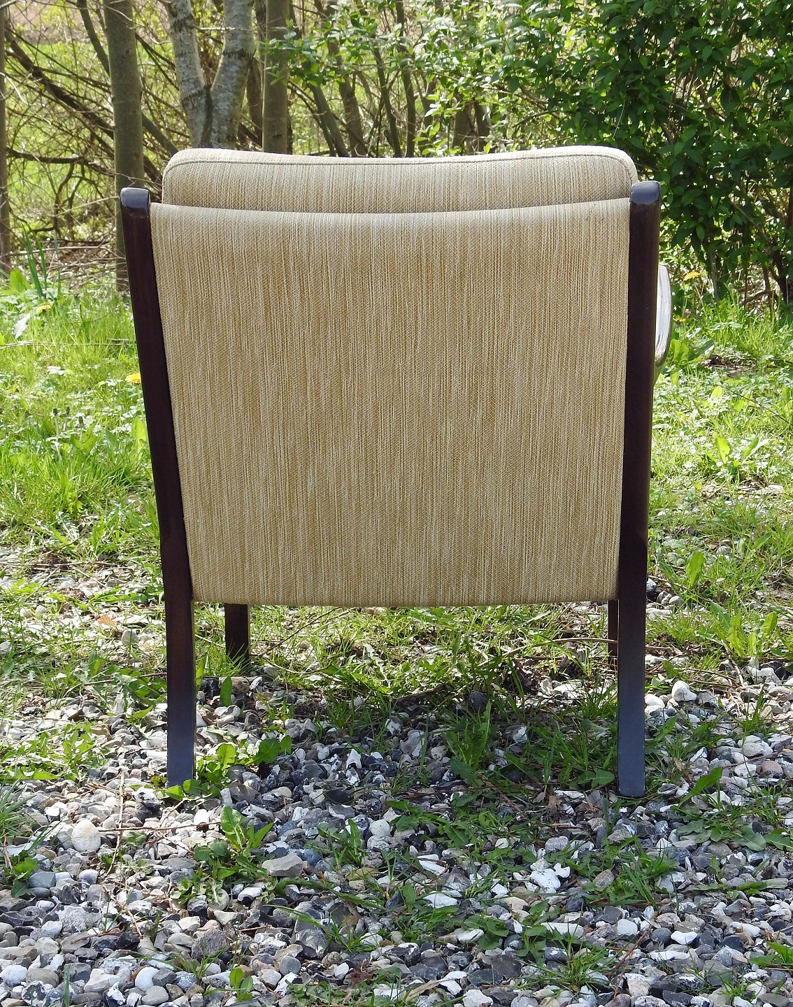 Fremstår med stel af lakeret men solbleget mahogni og intakt gyldenmeleret uldbetræk. Lettere brugsspor på ben.