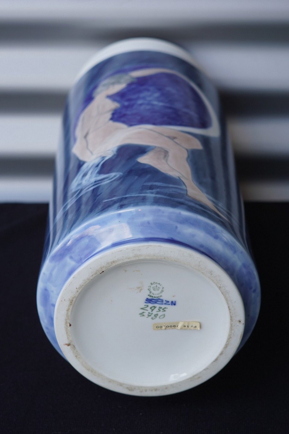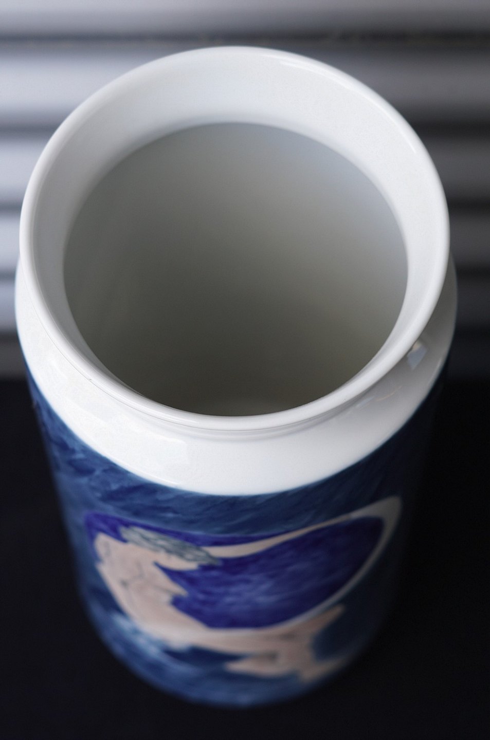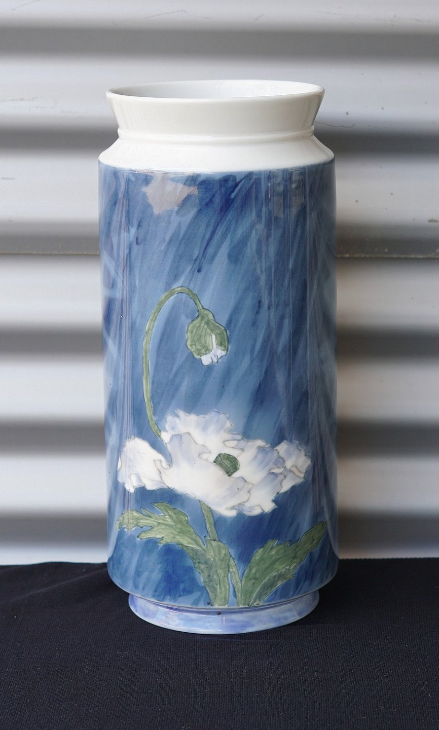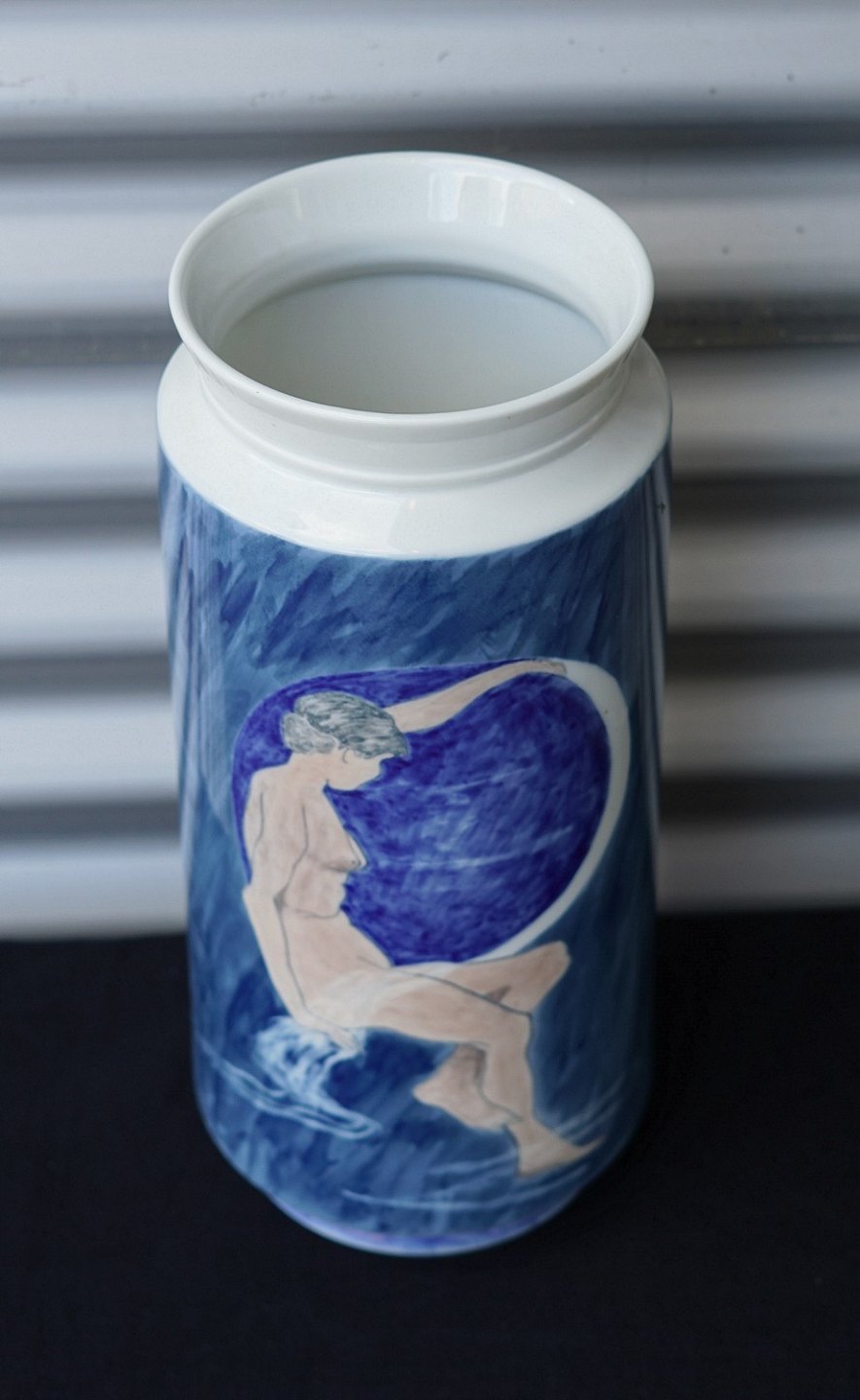 Royal Copenhagen cylinderformet vase (2935/5780) dekoreret i blåt og hvidt i form af nøgen kvinde og en valmue