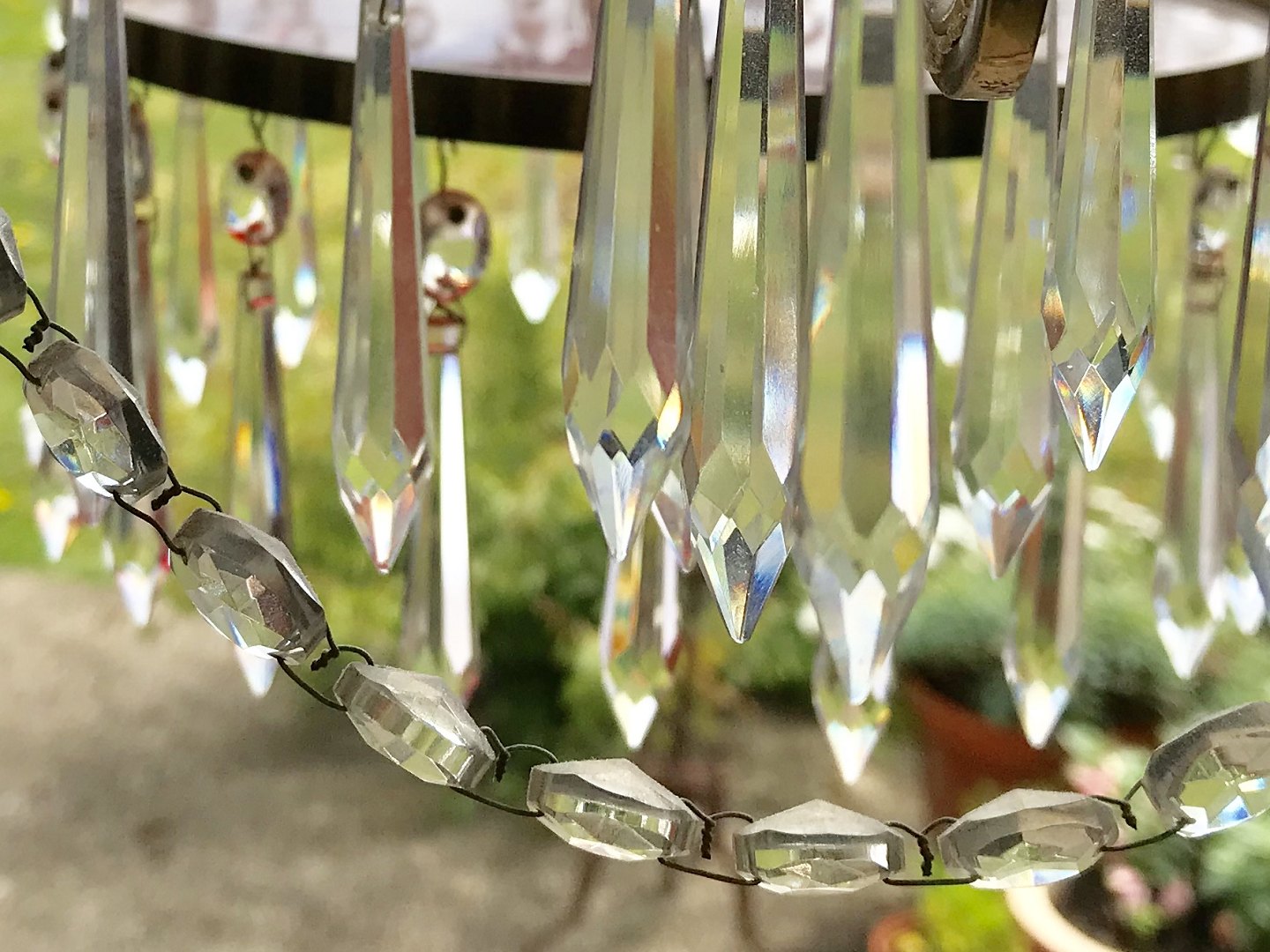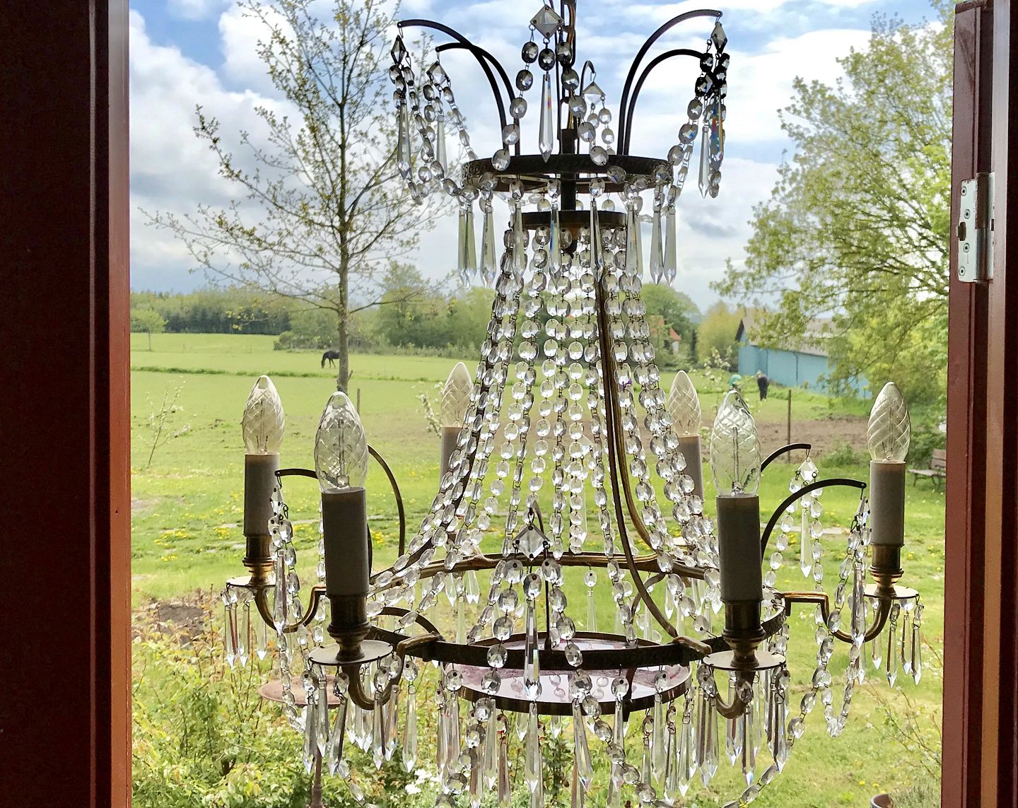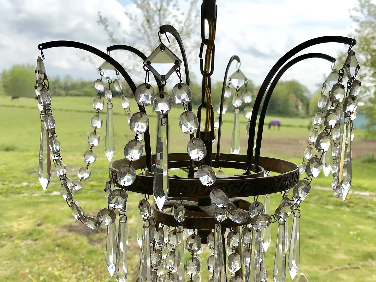 Lysekrone med slebne glasprismer og bundplade i rødt glas. Højde ca. 60 cm *Lysekronen fremstår generelt i fin brugt stand dog med et par enkelte prismer i stykker*