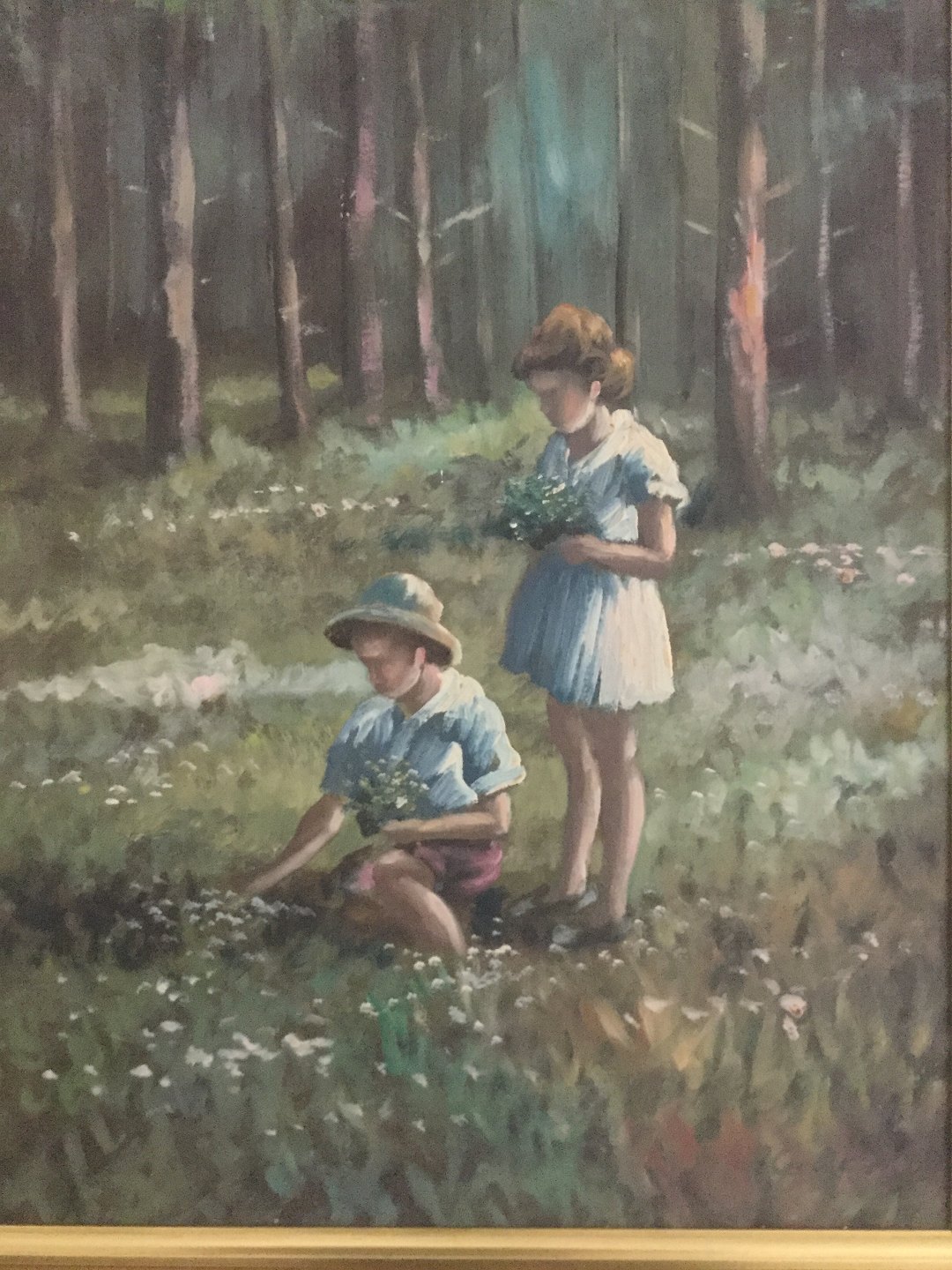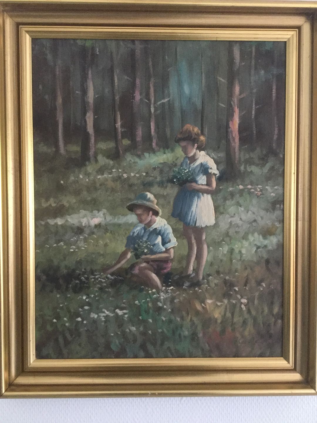 Maleri af Arling Gade - Børn plukker blomster i skov.